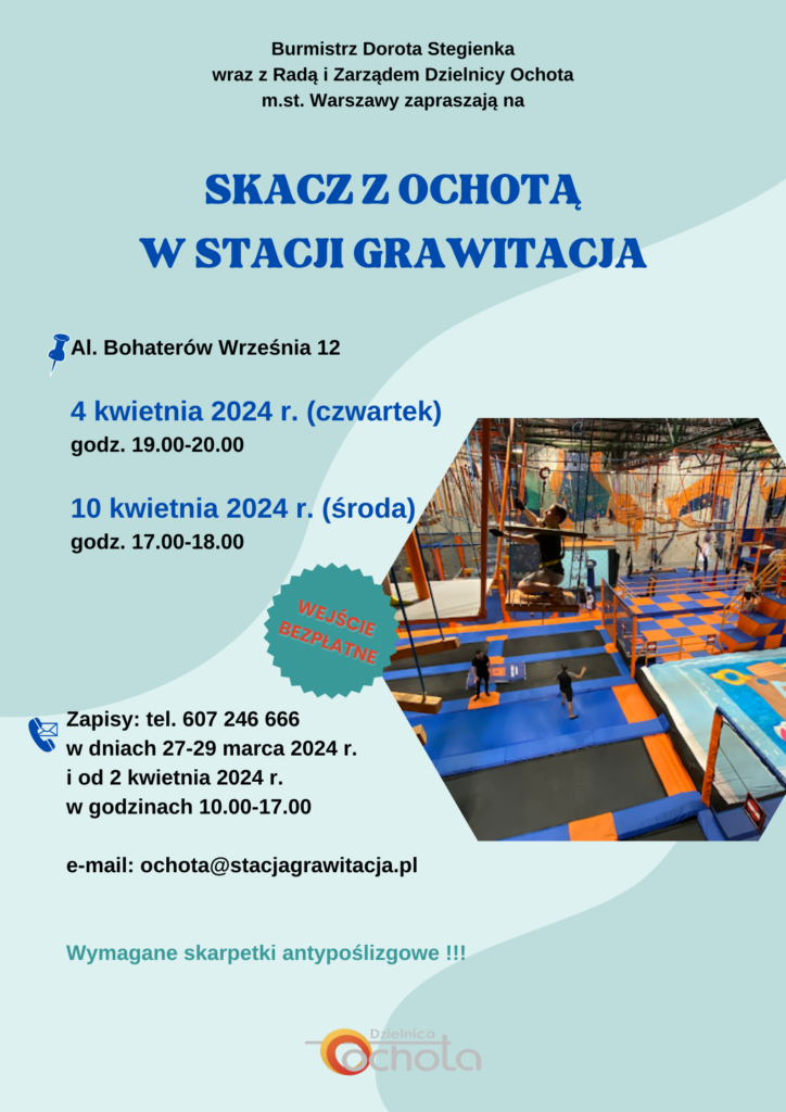 Zapraszamy do unikalnego Parku Trampolin, który oferuje atrakcje takie jak: park linowy, boisko do koszykówki i siatkówki z trampolinami, tor przeszkód Ninja, ścianki wspinaczkowe dla dużych i małych, poduszka z wieżami do skoków, interaktywne gry połączone z współzawodnictwem, wspinaniem i skakaniem, salę gimnastyczną z ścieżką gimnastyczną, antresolę widokową z kącikiem Bistro. Podczas wydarzenia pn. Ochockie skakanie w Parku Trampolin – Stacja Grawitacja! możesz skorzystać z tych wszystkich wyjątkowych atrakcji nieodpłatnie!!!
