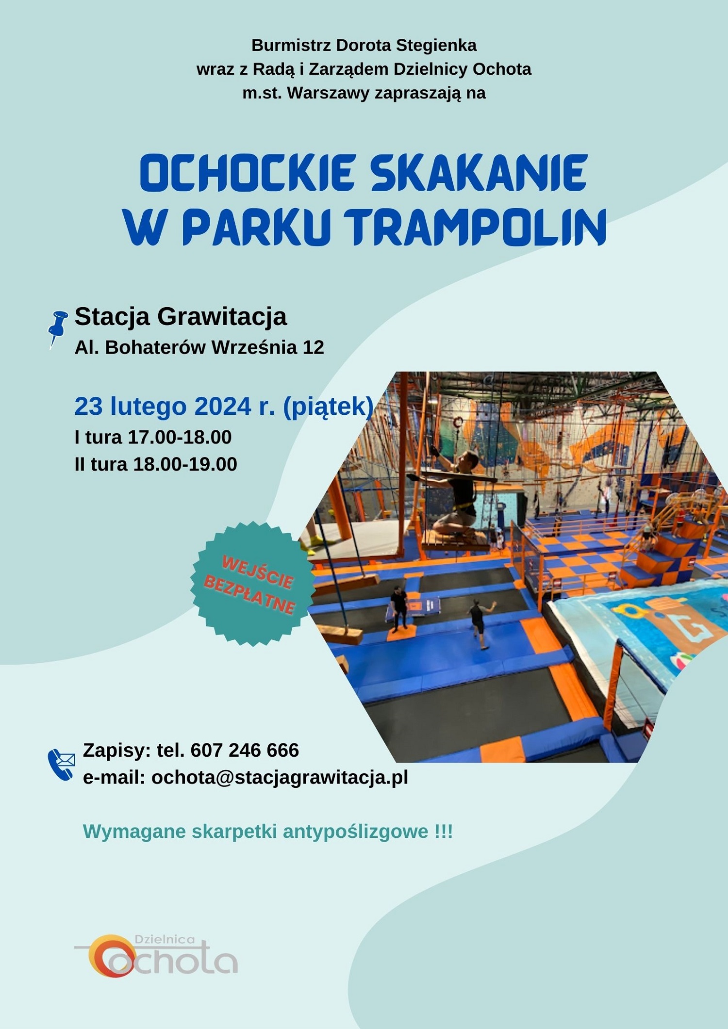 Zapraszamy do unikalnego Parku Trampolin, który oferuje atrakcje takie jak: park linowy, boisko do koszykówki i siatkówki z trampolinami, tor przeszkód Ninja, ścianki wspinaczkowe dla dużych i małych, poduszka z wieżami do skoków, interaktywne gry połączone z współzawodnictwem, wspinaniem i skakaniem, salę gimnastyczną z ścieżką gimnastyczną, antresolę widokową z kącikiem Bistro. Podczas wydarzenia pn. Ochockie skakanie w Parku Trampolin – Stacja Grawitacja! możesz skorzystać z tych wszystkich wyjątkowych atrakcji nieodpłatnie!!!