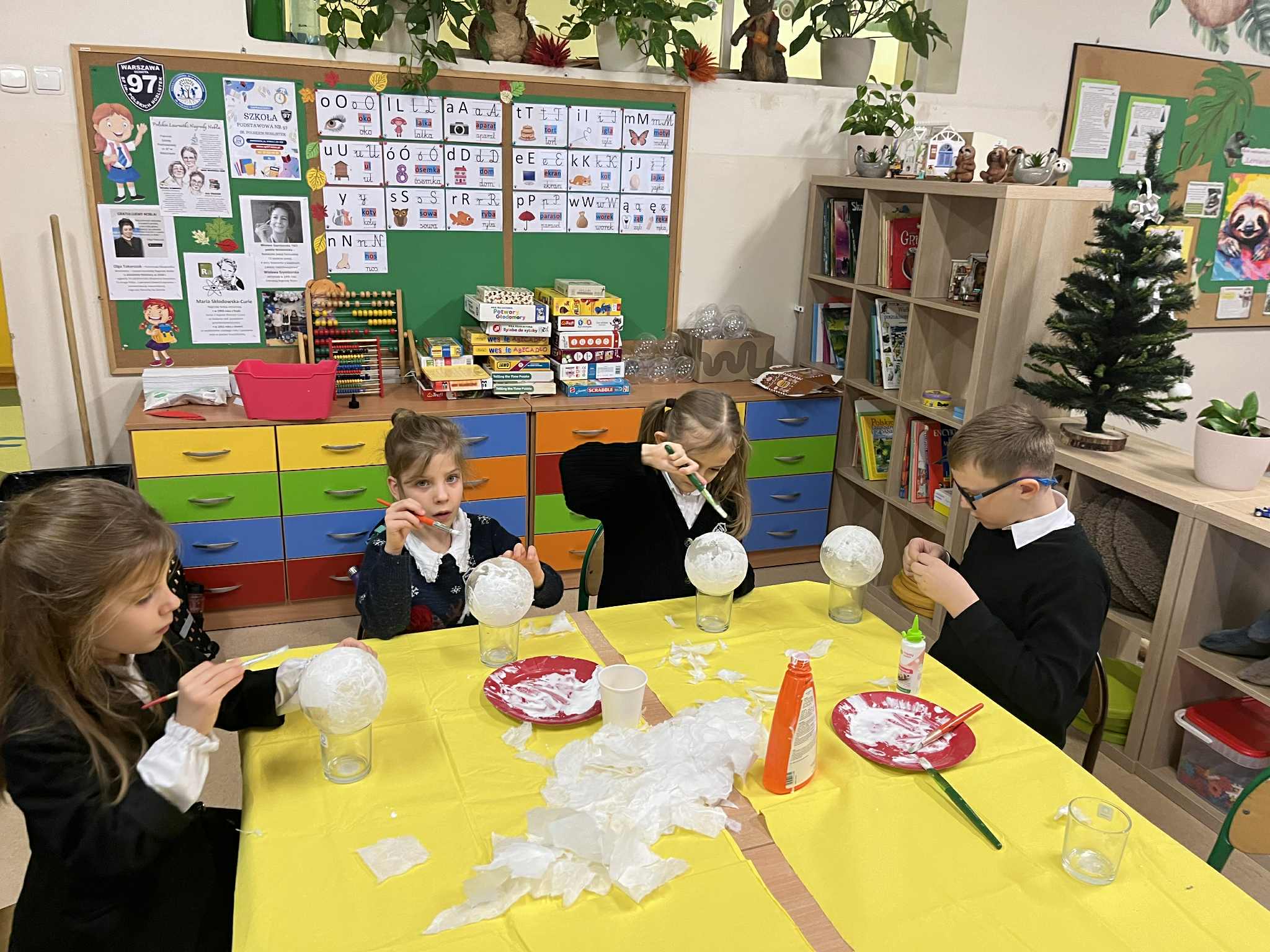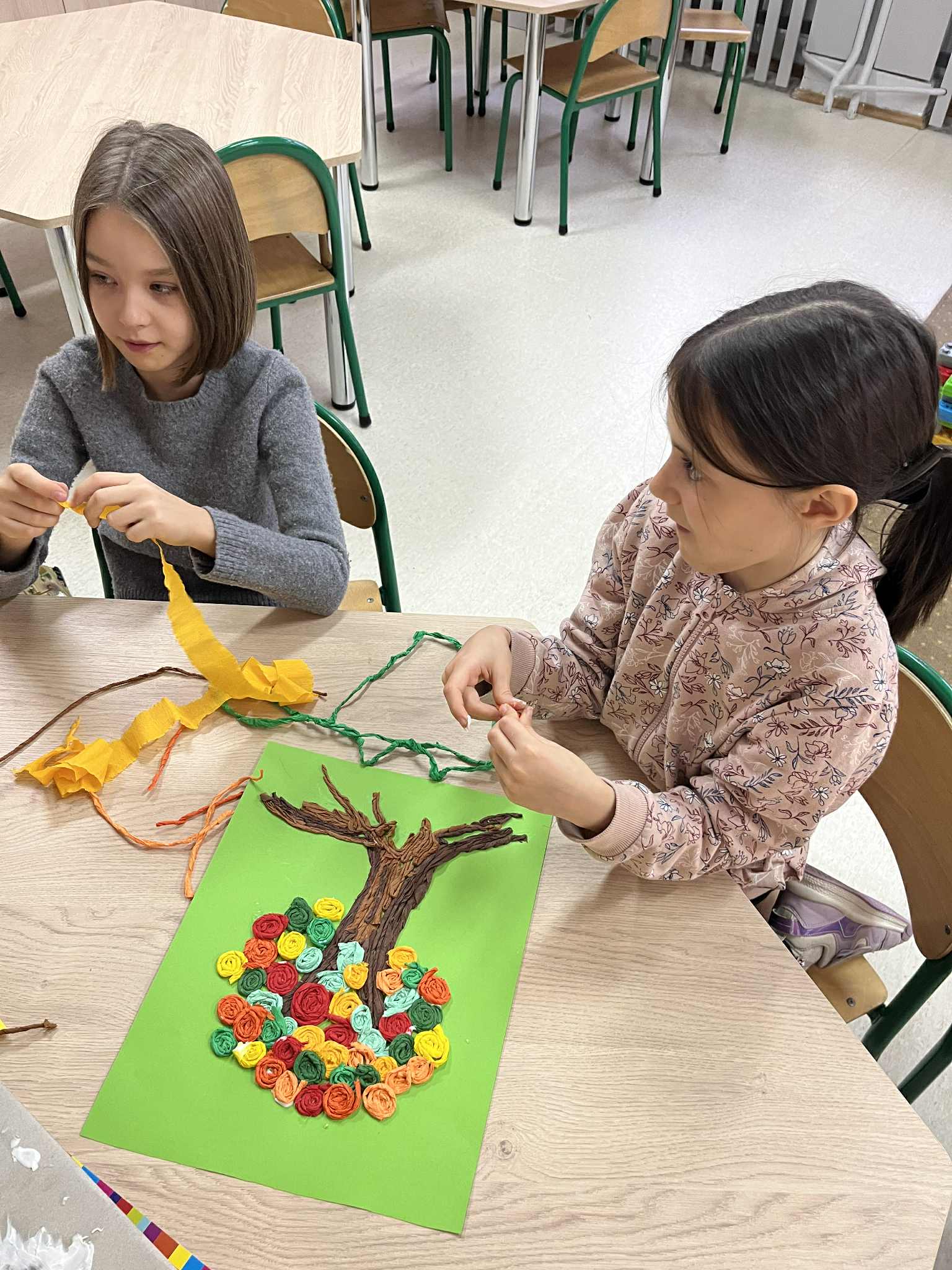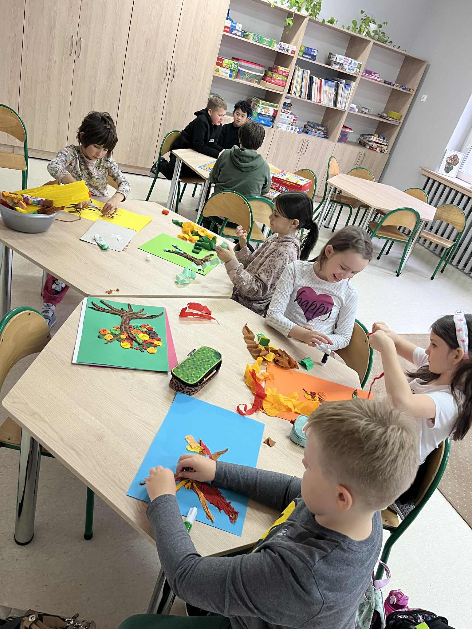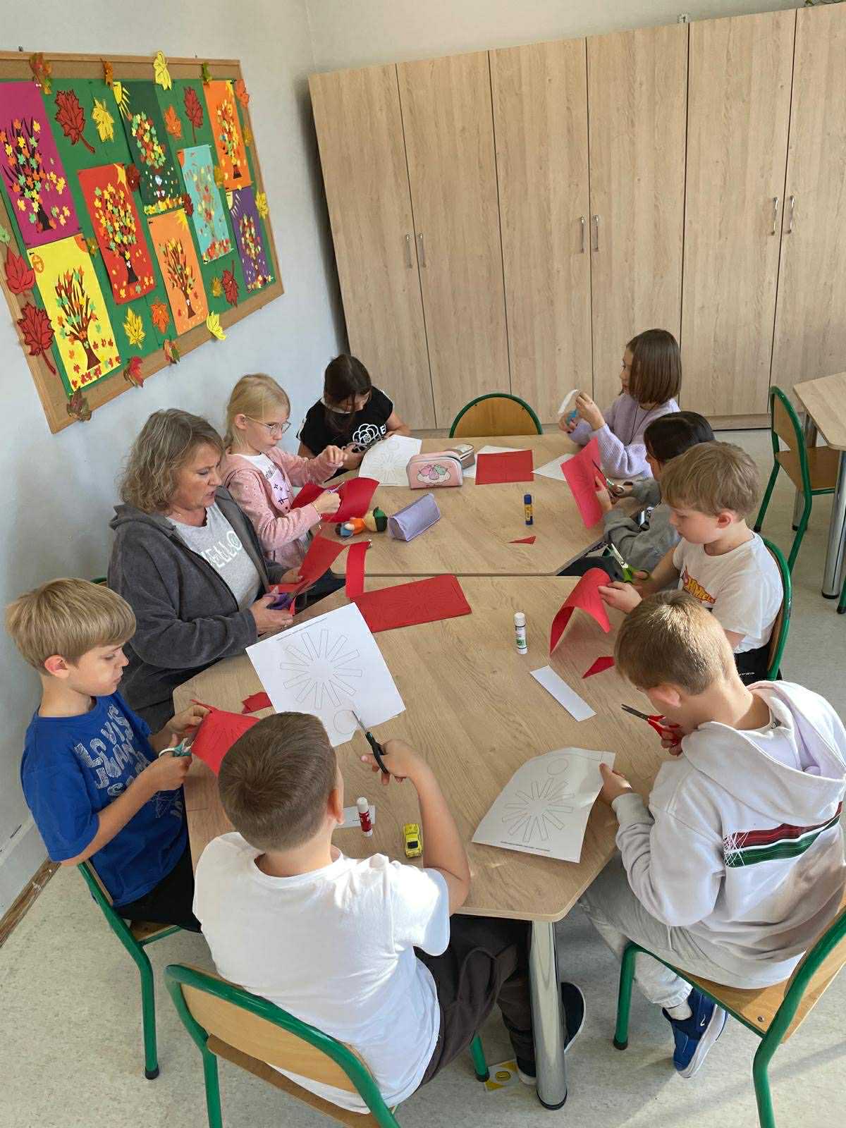 W naszej świetlicy dzieci tworzą przepiękne prace plastyczne, grają w gry stolikowe, układają z klocków statki, śpiewają z panem Januszem, słuchają legend, które opowiada pani Ania, bawią się na dworze, grają w piłkę nożną lub grają w sali judo, odpoczywają w sali wyciszenia. Świetlicowy artysta to dodatkowe zajęcia plastyczne podczas których dzieci wykonują ciekawe prace. W tym tygodniu uczestnicy stworzyli jesienne drzewo z krepiny.