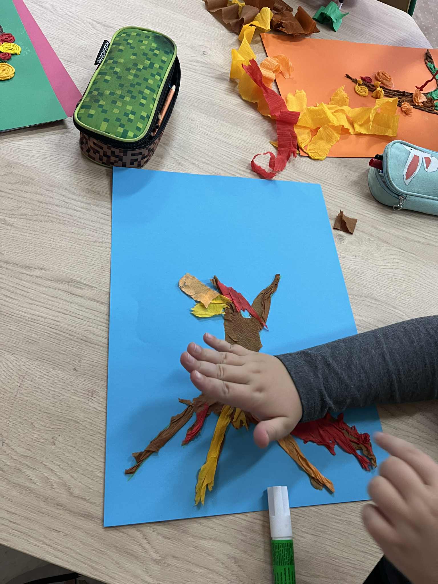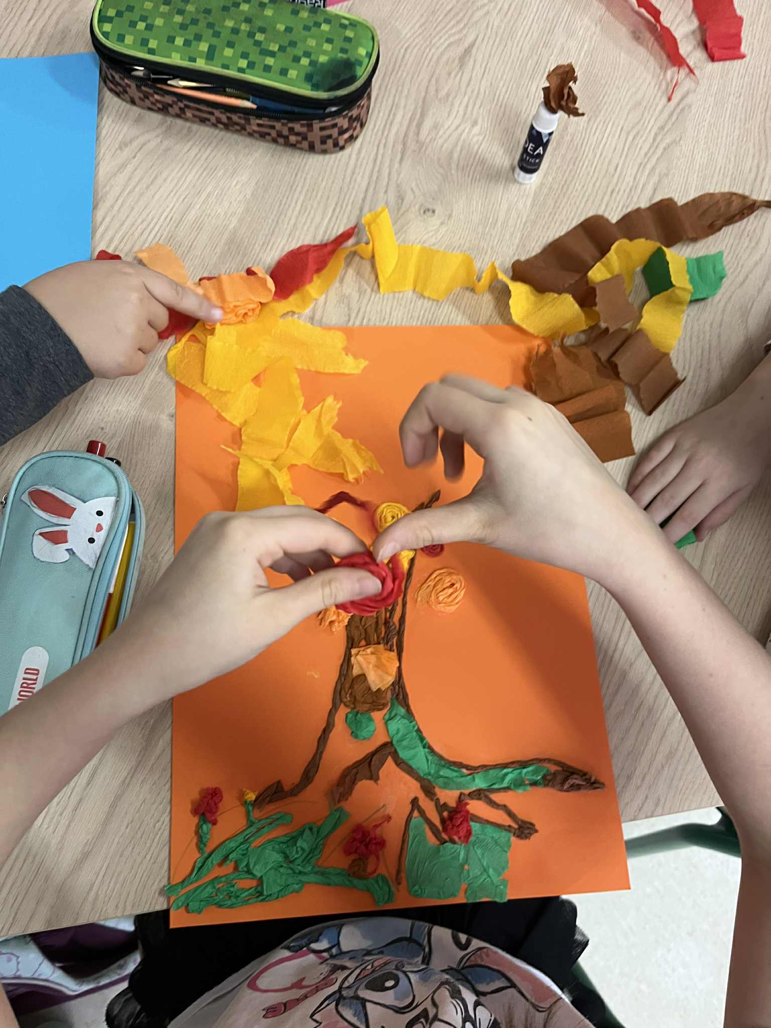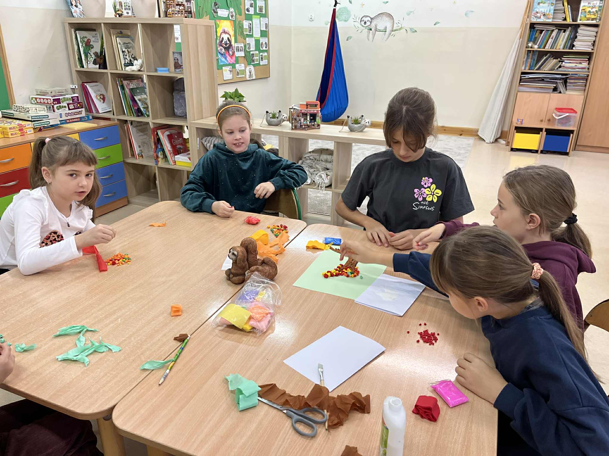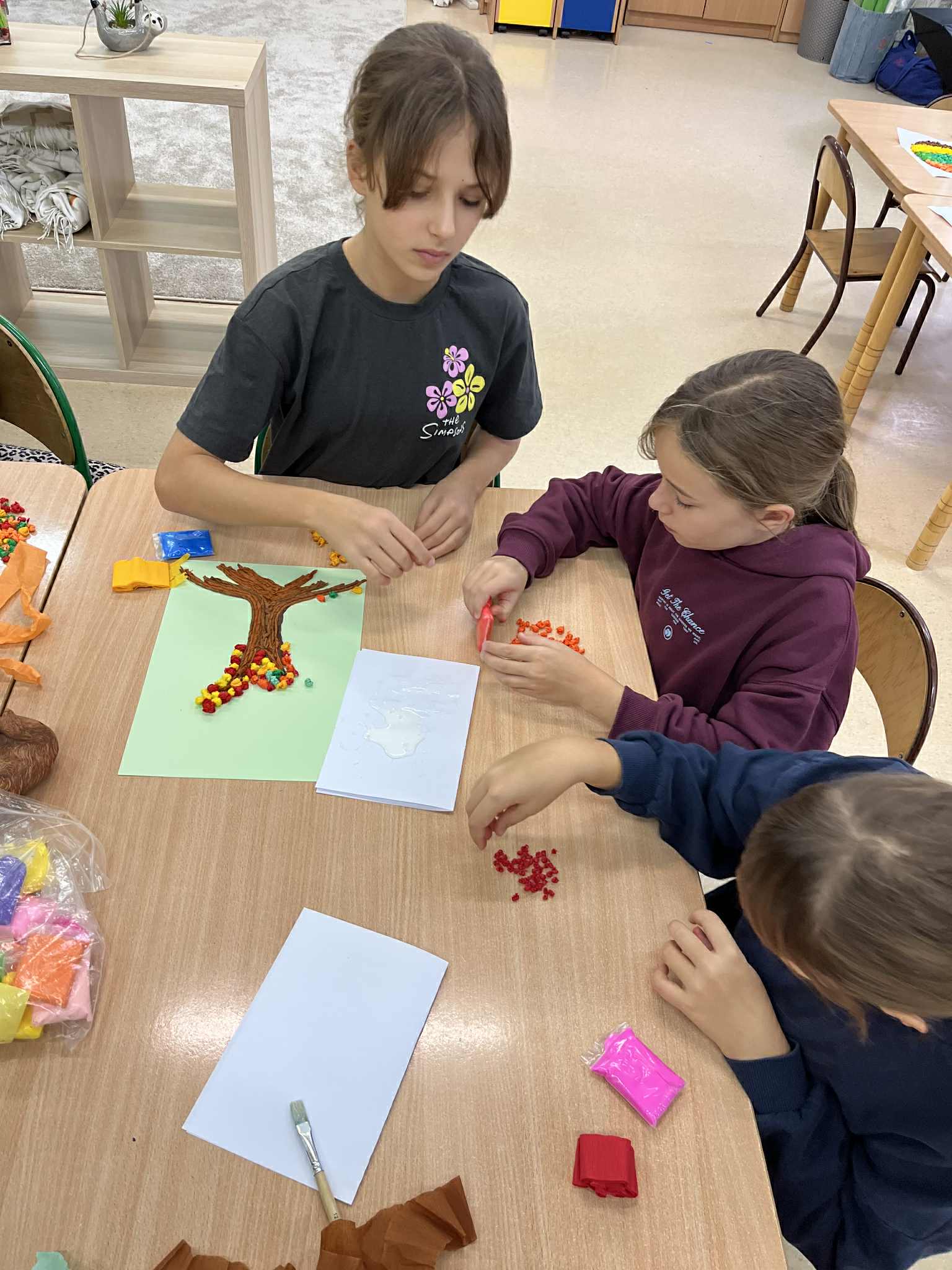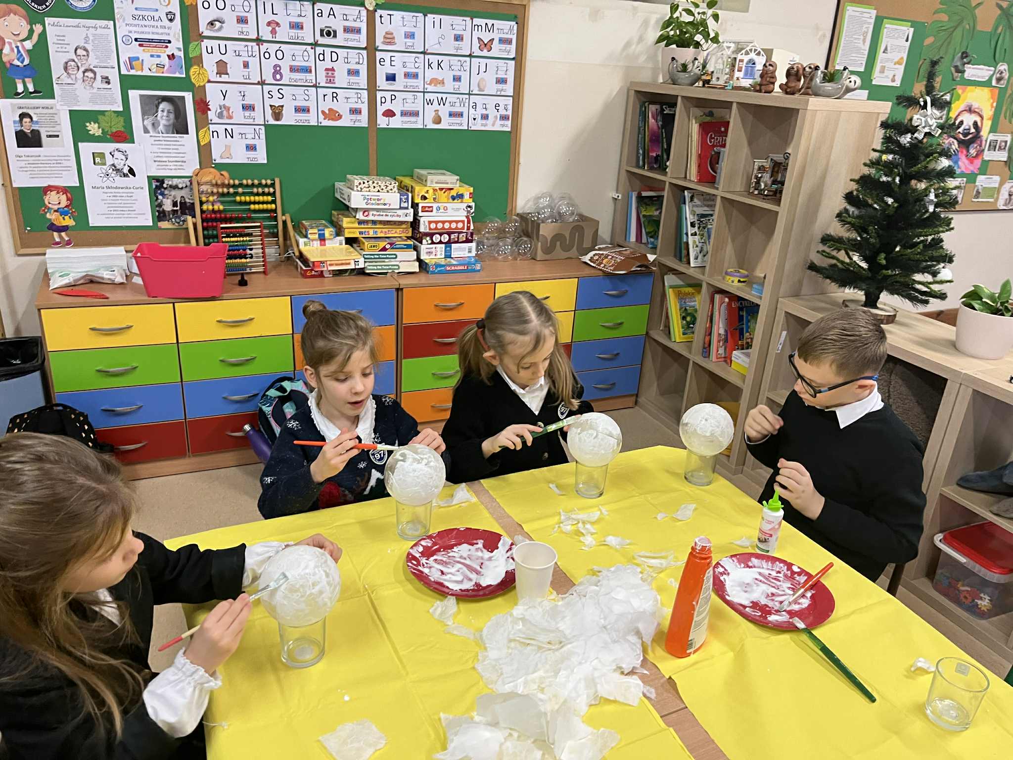 W naszej świetlicy dzieci tworzą przepiękne prace plastyczne, grają w gry stolikowe, układają z klocków statki, śpiewają z panem Januszem, słuchają legend, które opowiada pani Ania, bawią się na dworze, grają w piłkę nożną lub grają w sali judo, odpoczywają w sali wyciszenia. Świetlicowy artysta to dodatkowe zajęcia plastyczne podczas których dzieci wykonują ciekawe prace. W tym tygodniu uczestnicy stworzyli jesienne drzewo z krepiny.