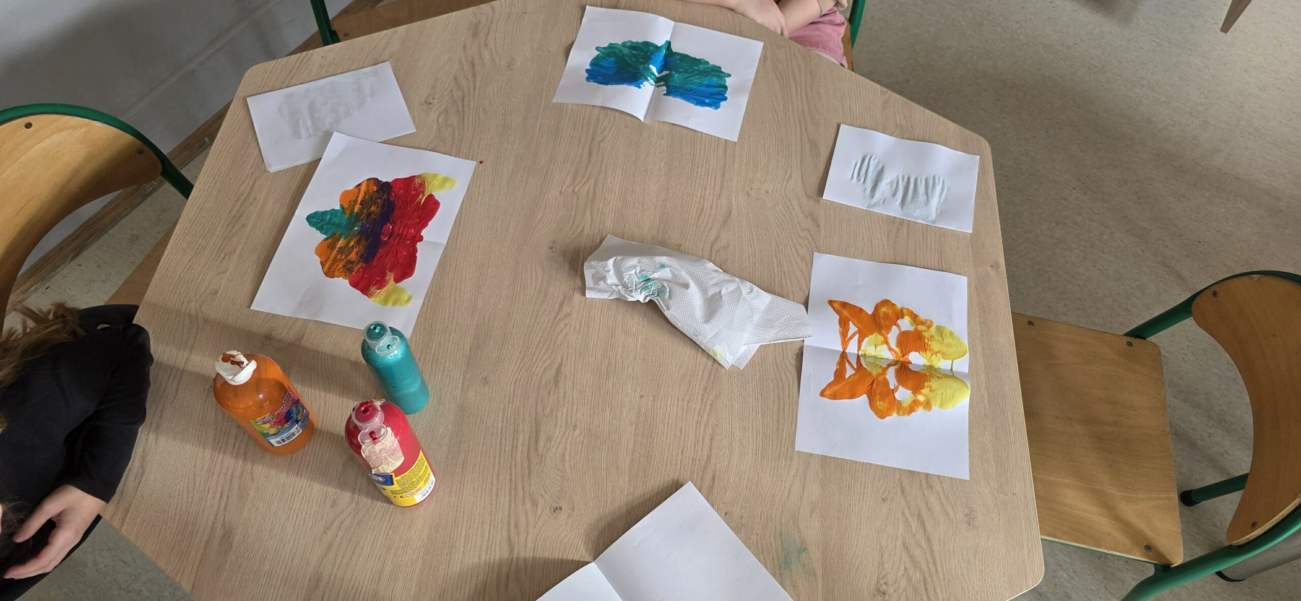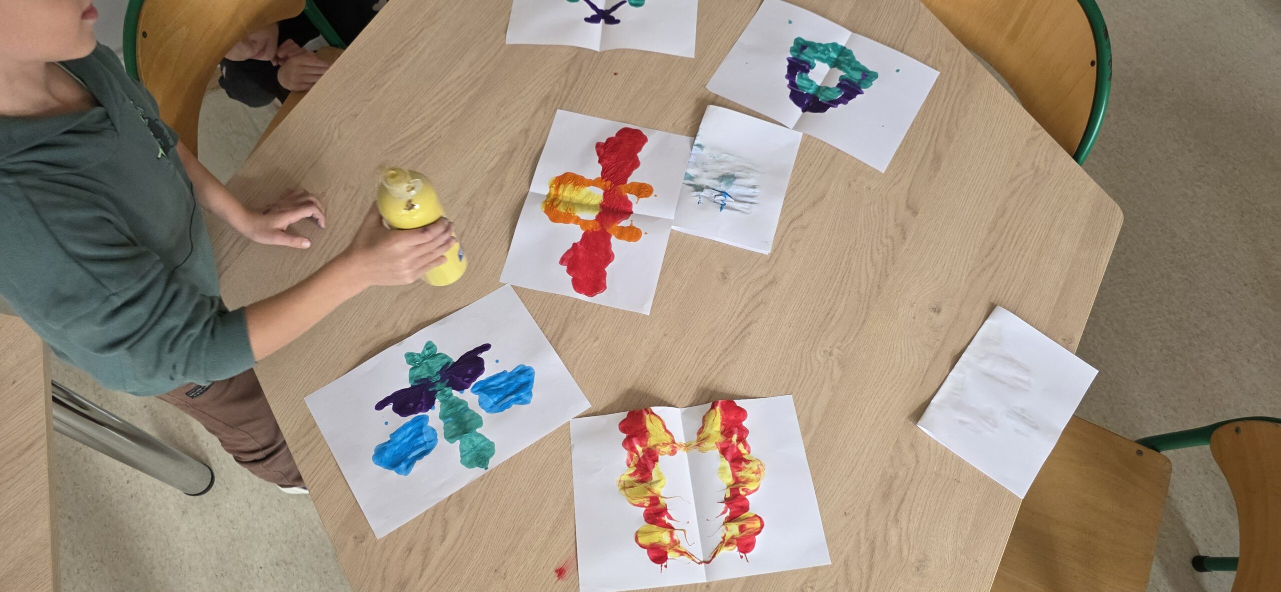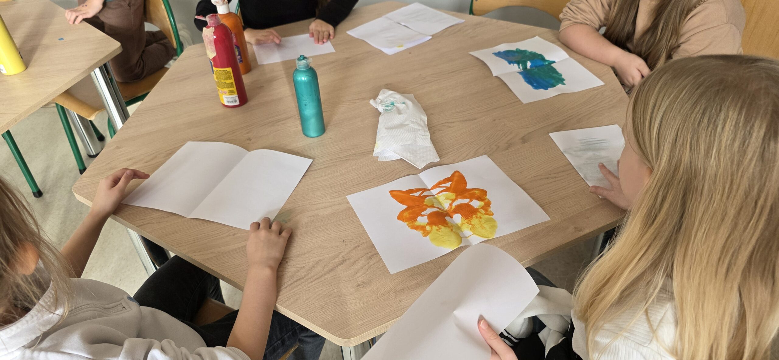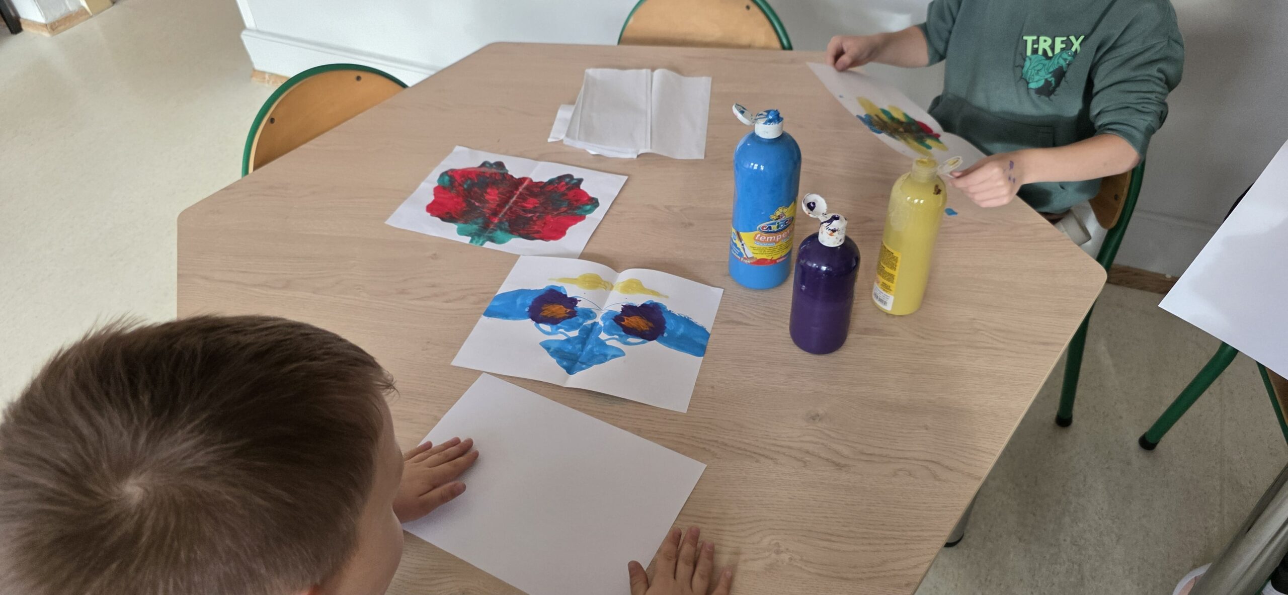 Podczas zajęć plastycznych dzieci tworzyły niezwykłe, kolorowe (a czasem czarno-białe) plamy atramentowe i farbowe, które – po złożeniu kartki – zamieniały się w fantazyjne kształty. Każdy mógł w nich dostrzec coś innego: motyla, kwiat, robota, a może potwora z innej planety? ![]()