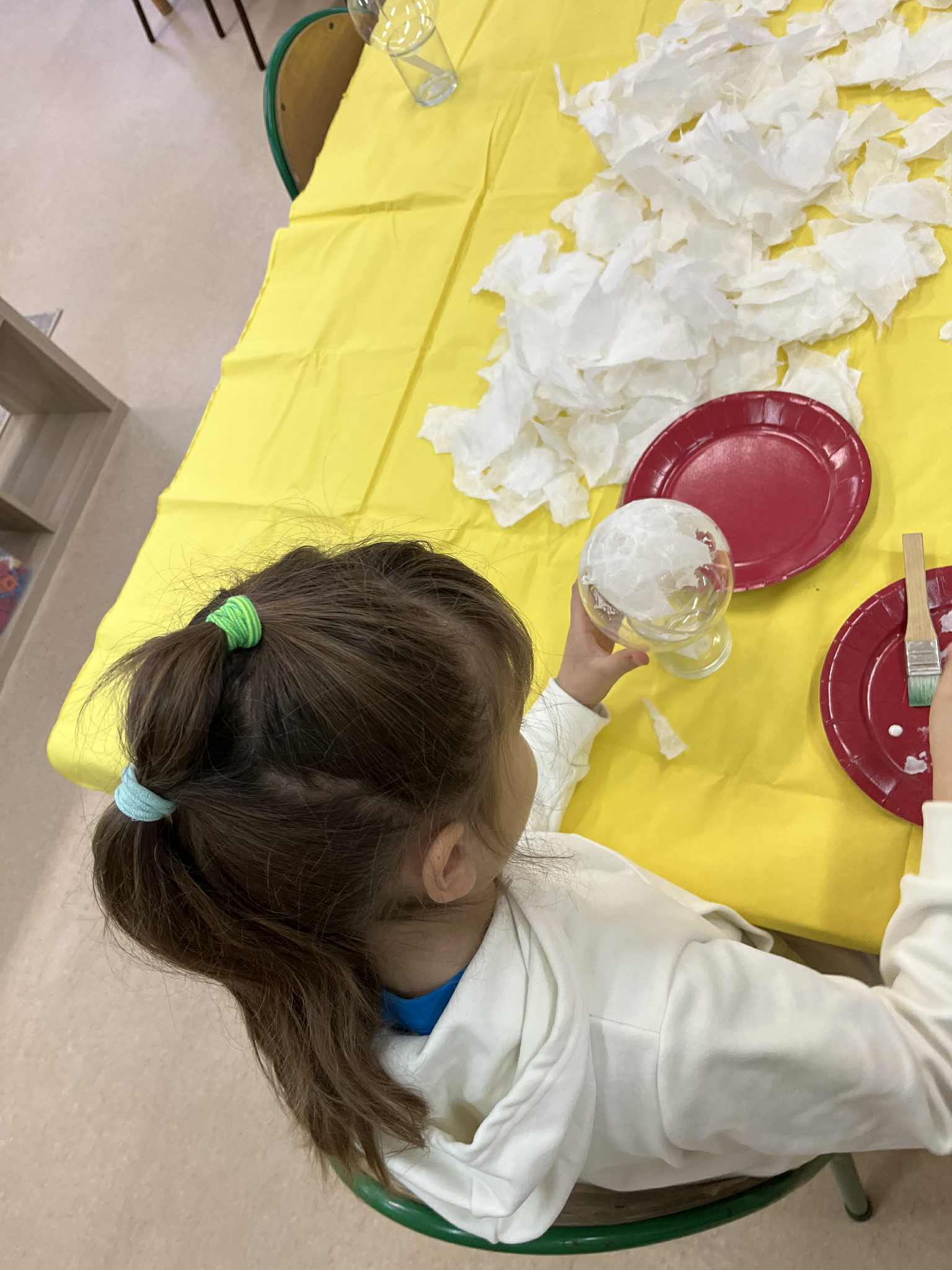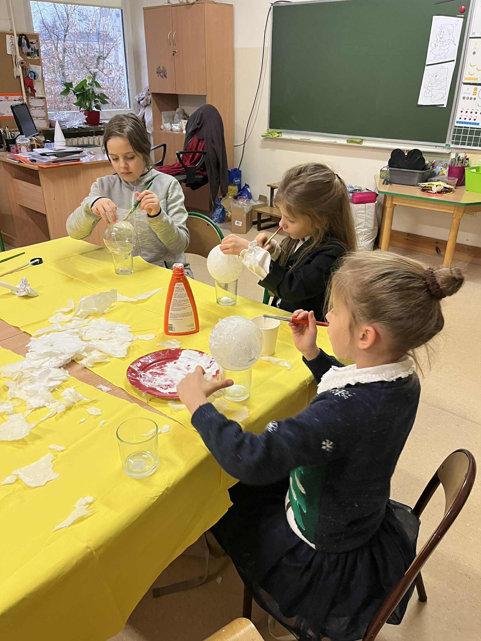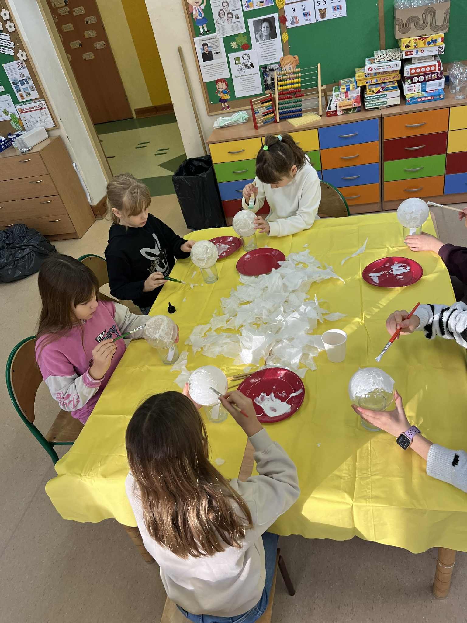 Świetlicowy artysta - drugie zajęcia z bombkami. Część dzieci pokrywało bombkę papierem ryżowym a część już serwetkami. Na następnych zajęcia będziemy ozdabiać i pięknie pakować. To będzie wspaniała pamiątka i ozdoba zbliżających się świąt.