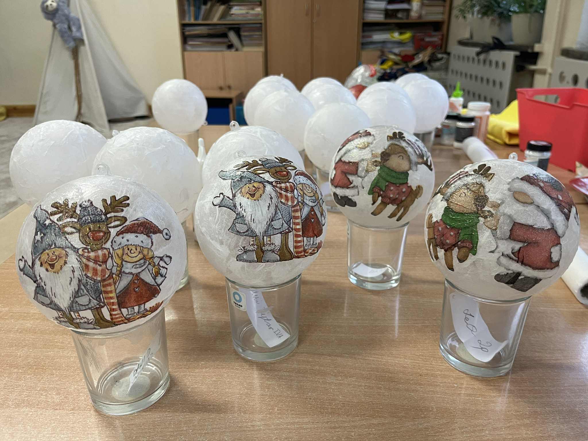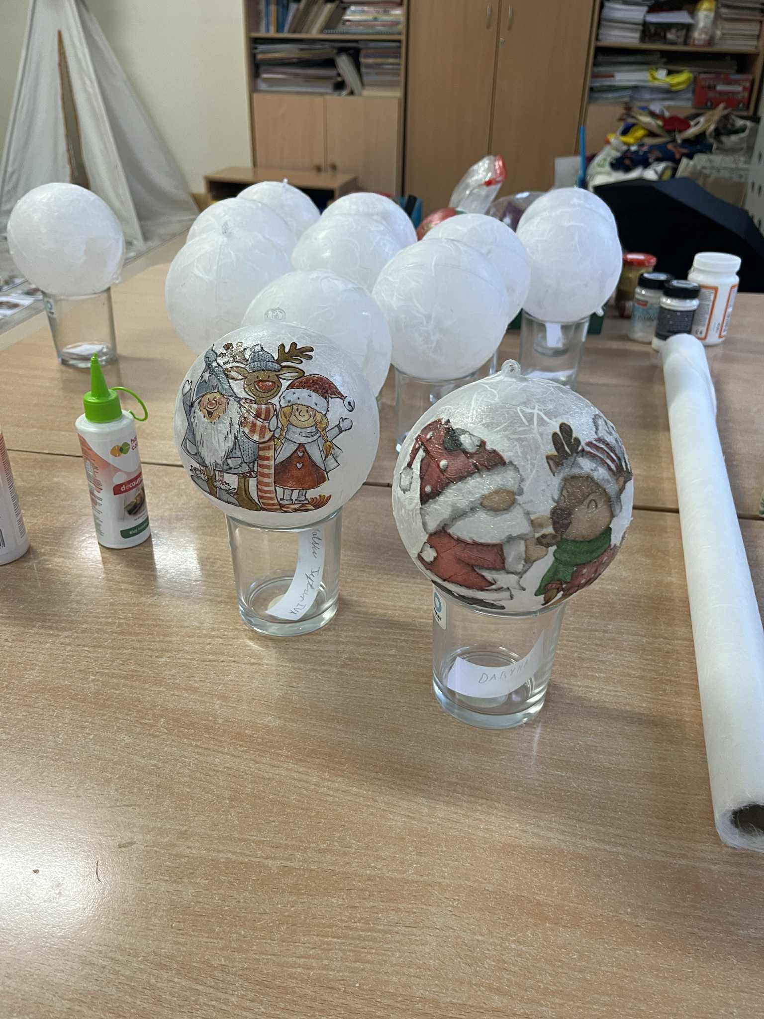 Rozpoczęliśmy tworzenie bombek techniką decoupage. Został przyklejony papier ryżowy. Za tydzień osoby które to zrobiły będą naklejały serwetki i je ozdabiały. Każdy twórca zabierze swoją pracę do domu.