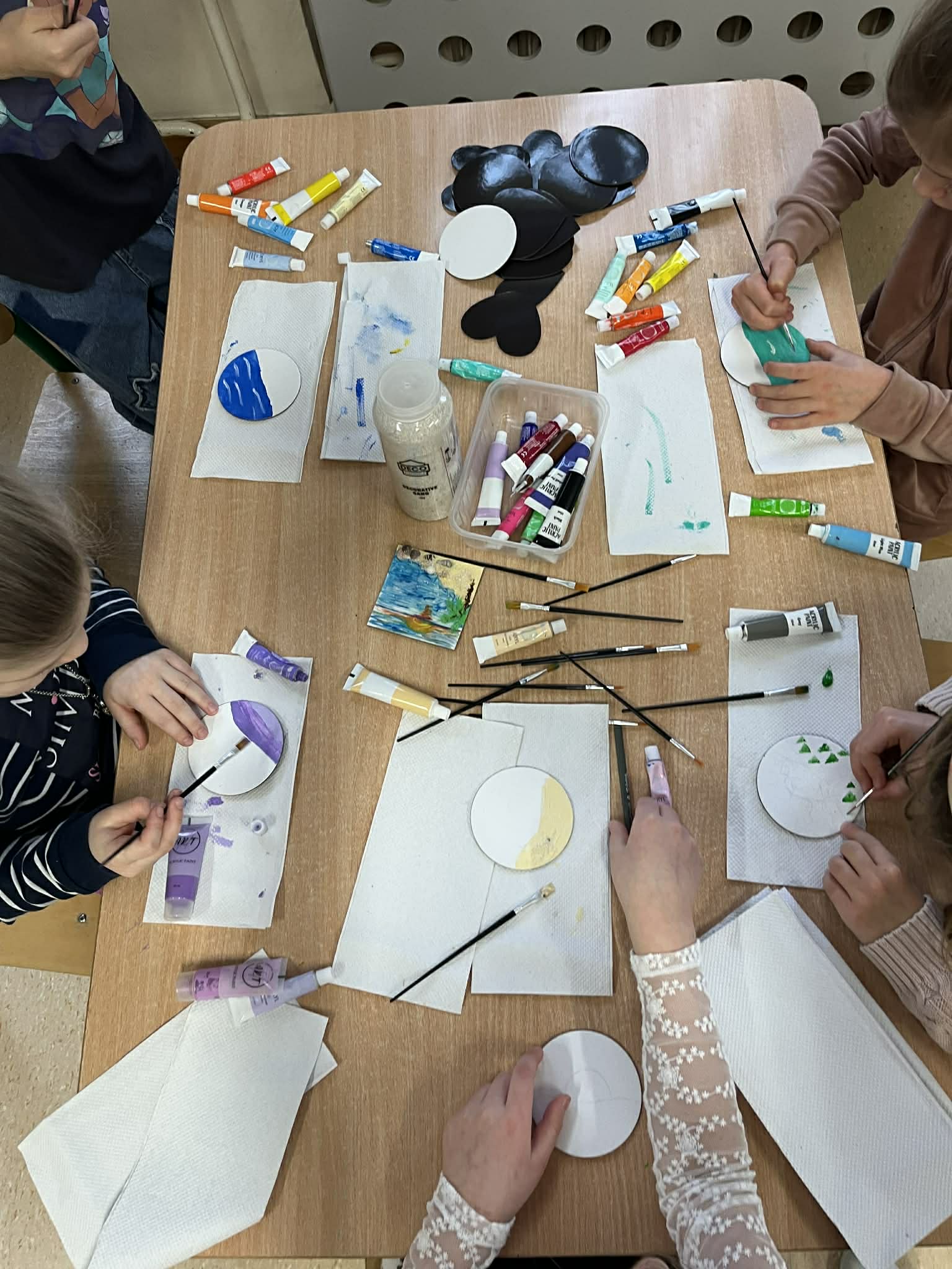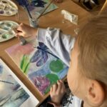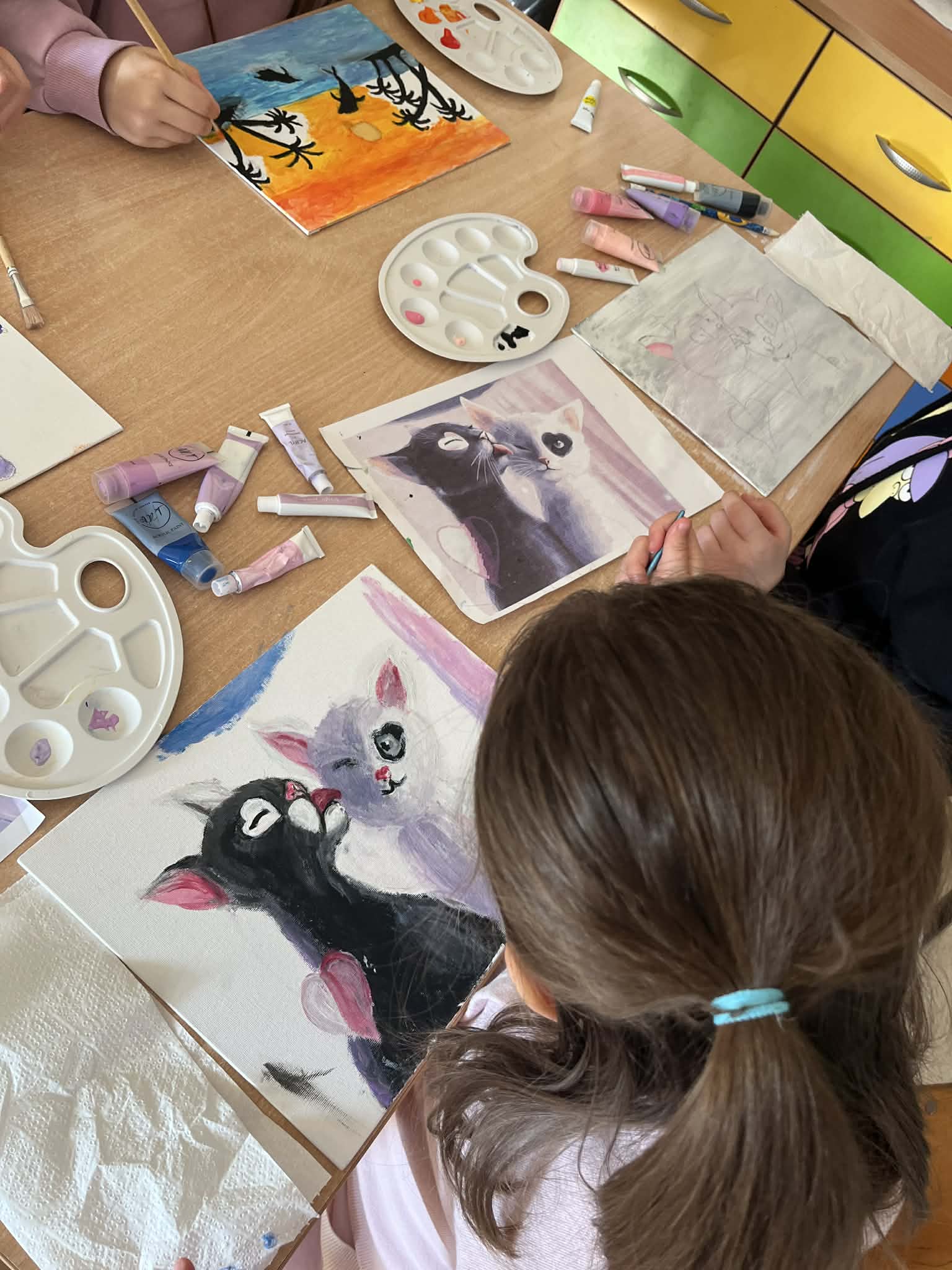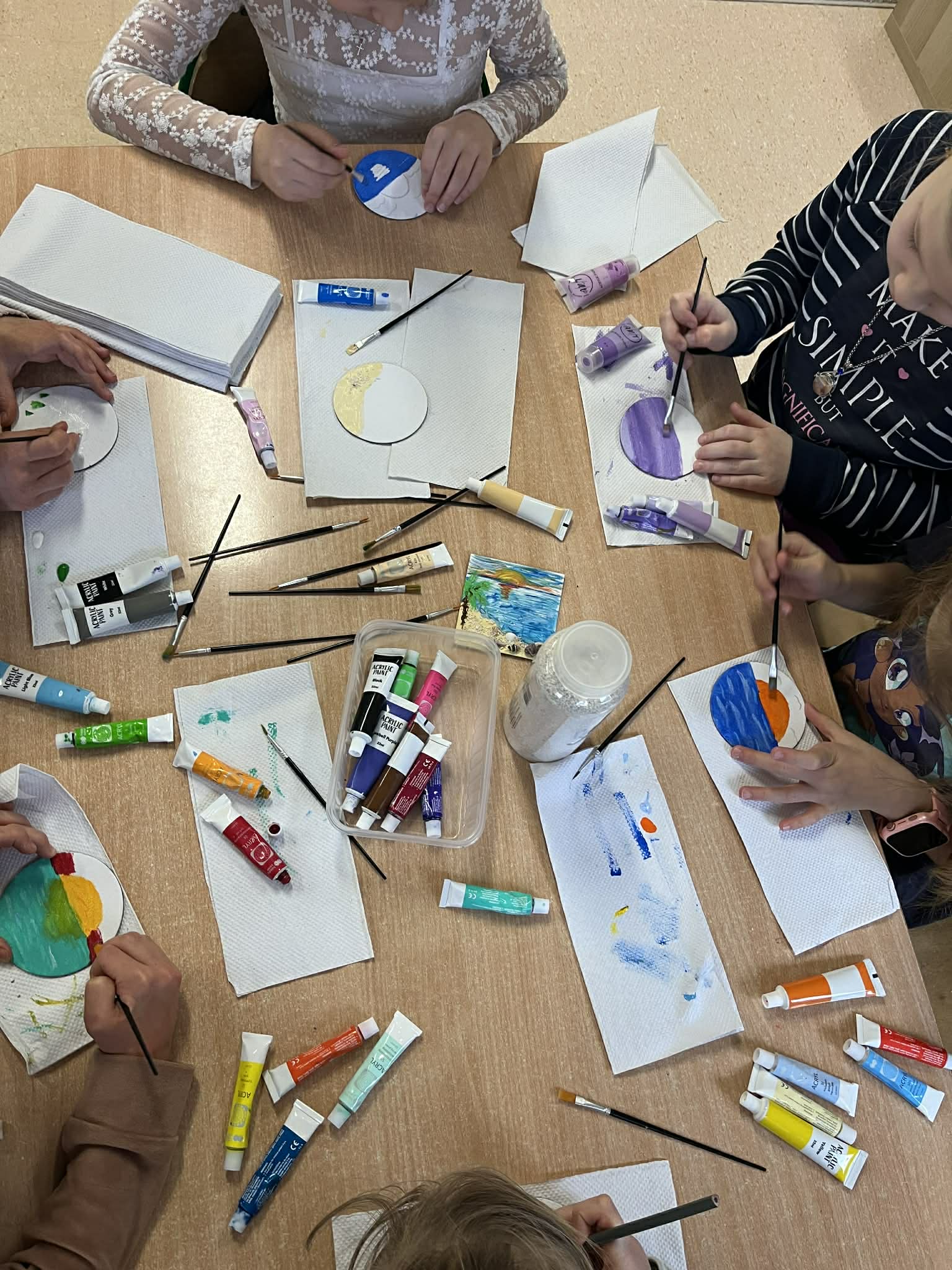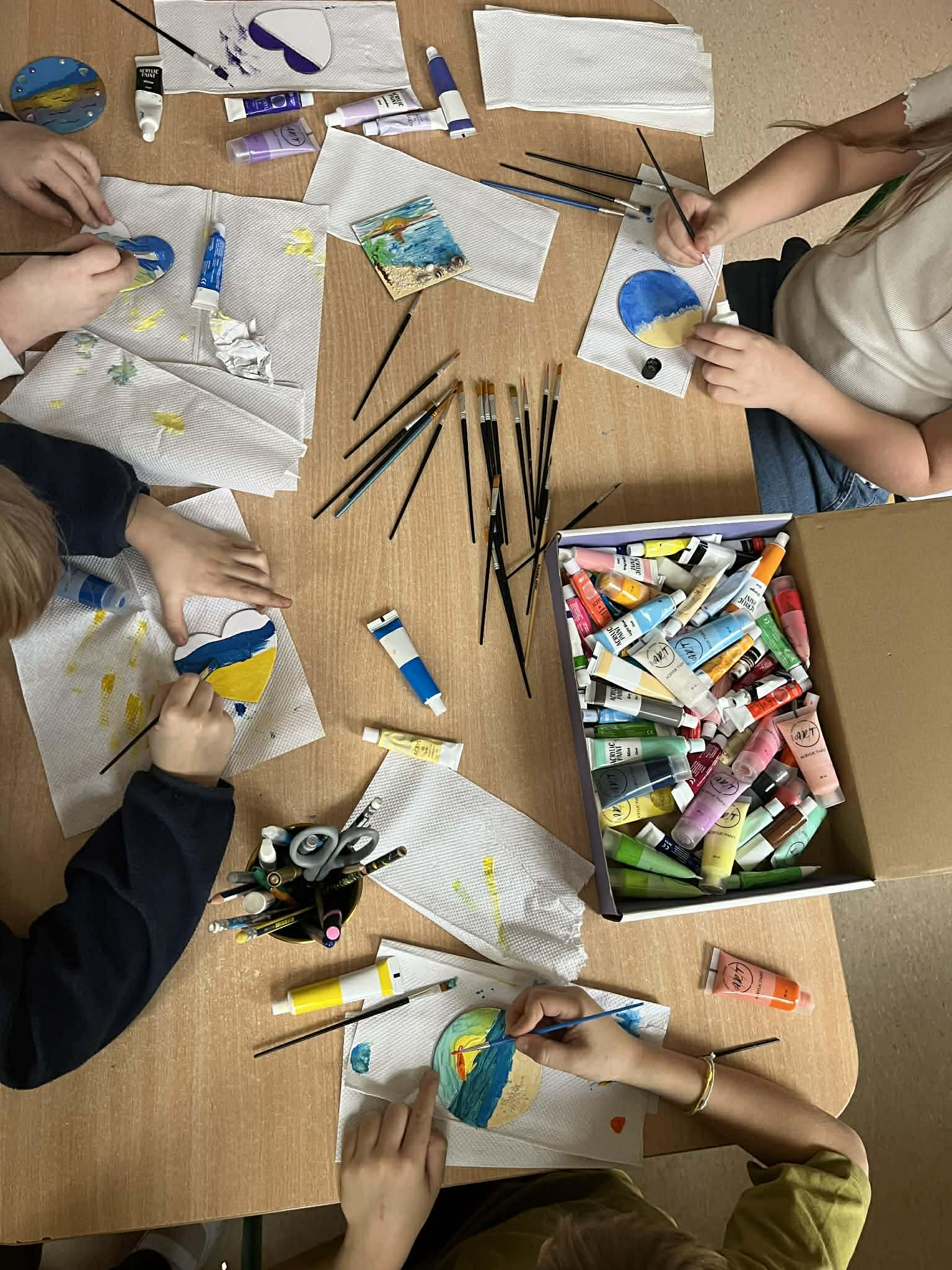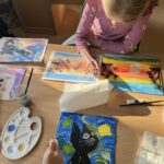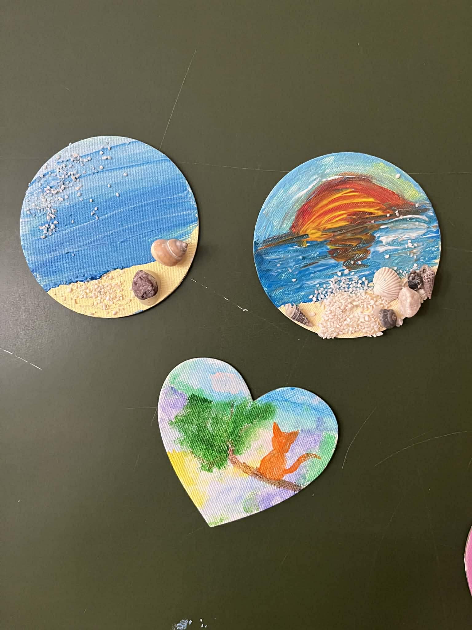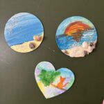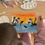 Ciąg dalszy malowania farbami na magnesach pokrytych płótnem. Dzisiaj młodzi artyści malowali zachód słońca.