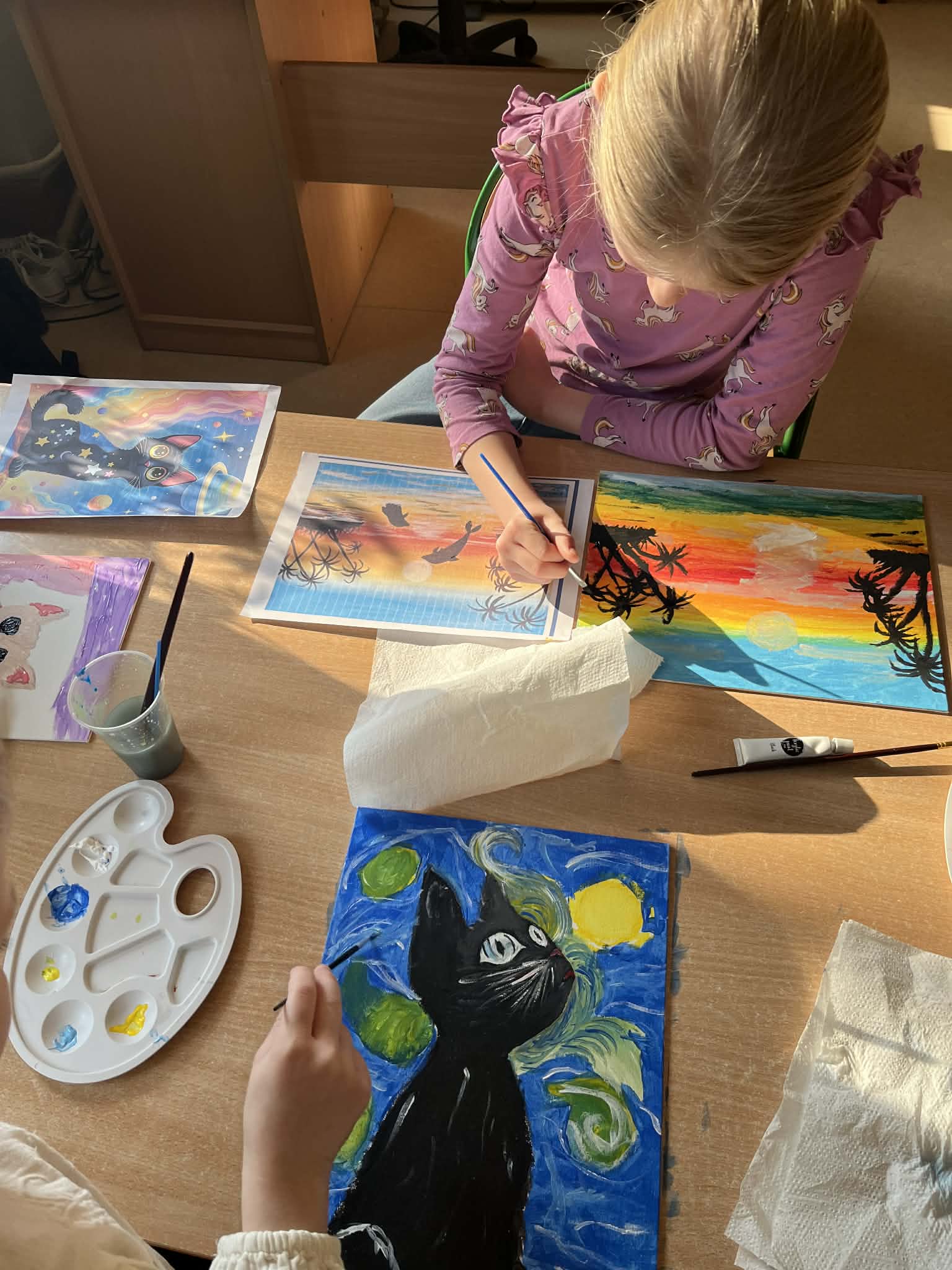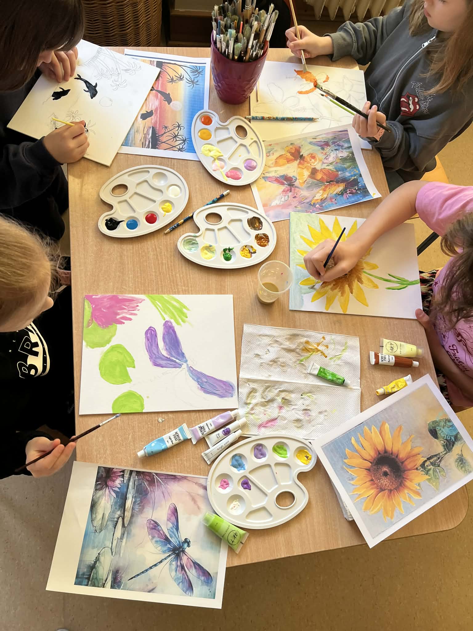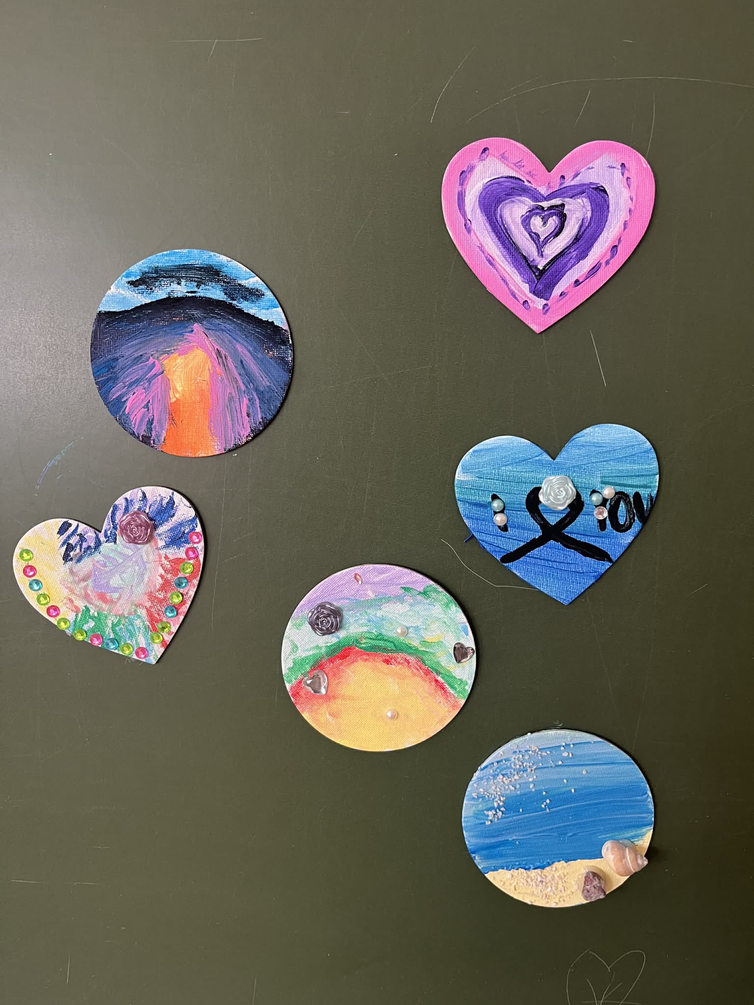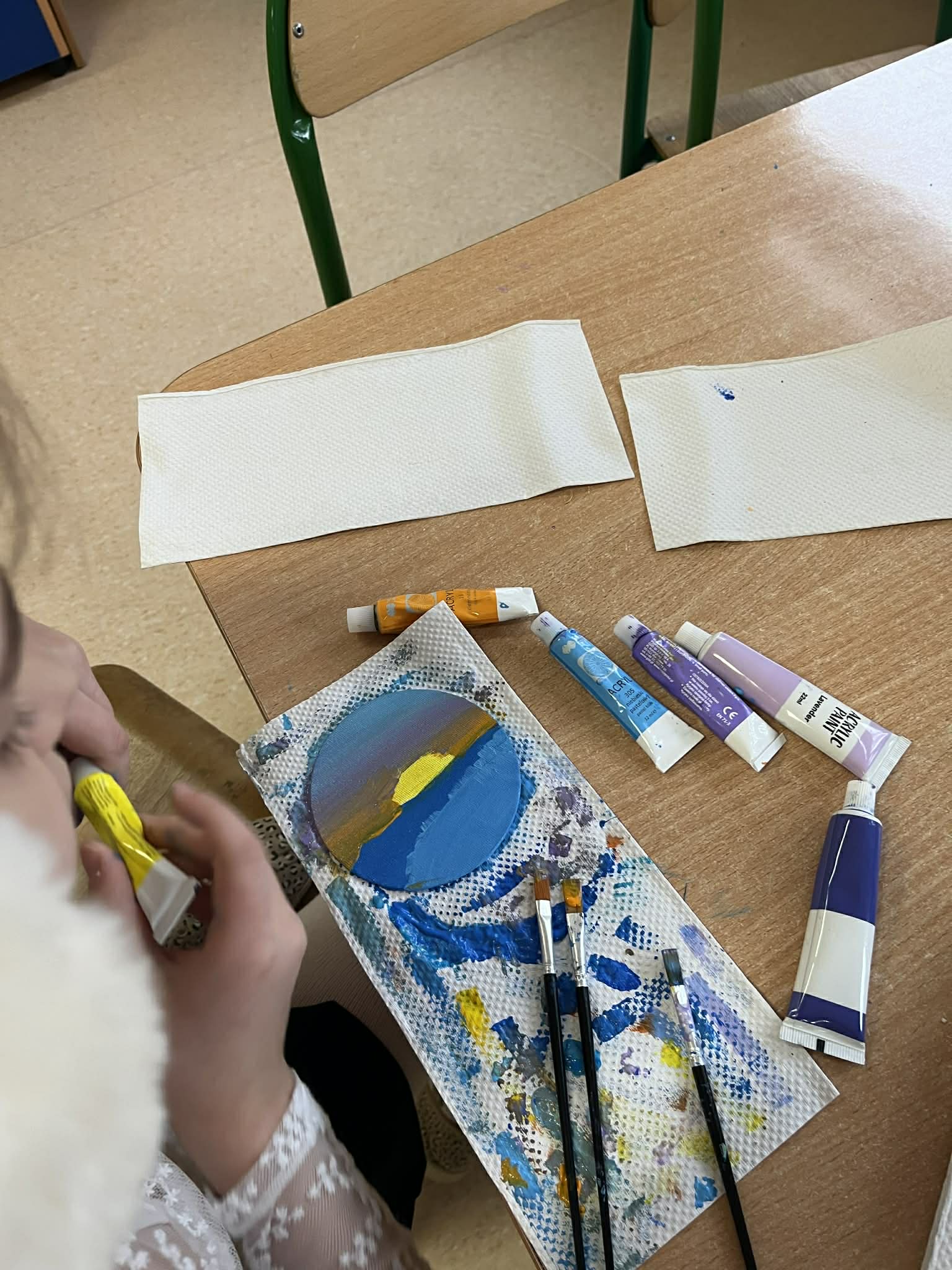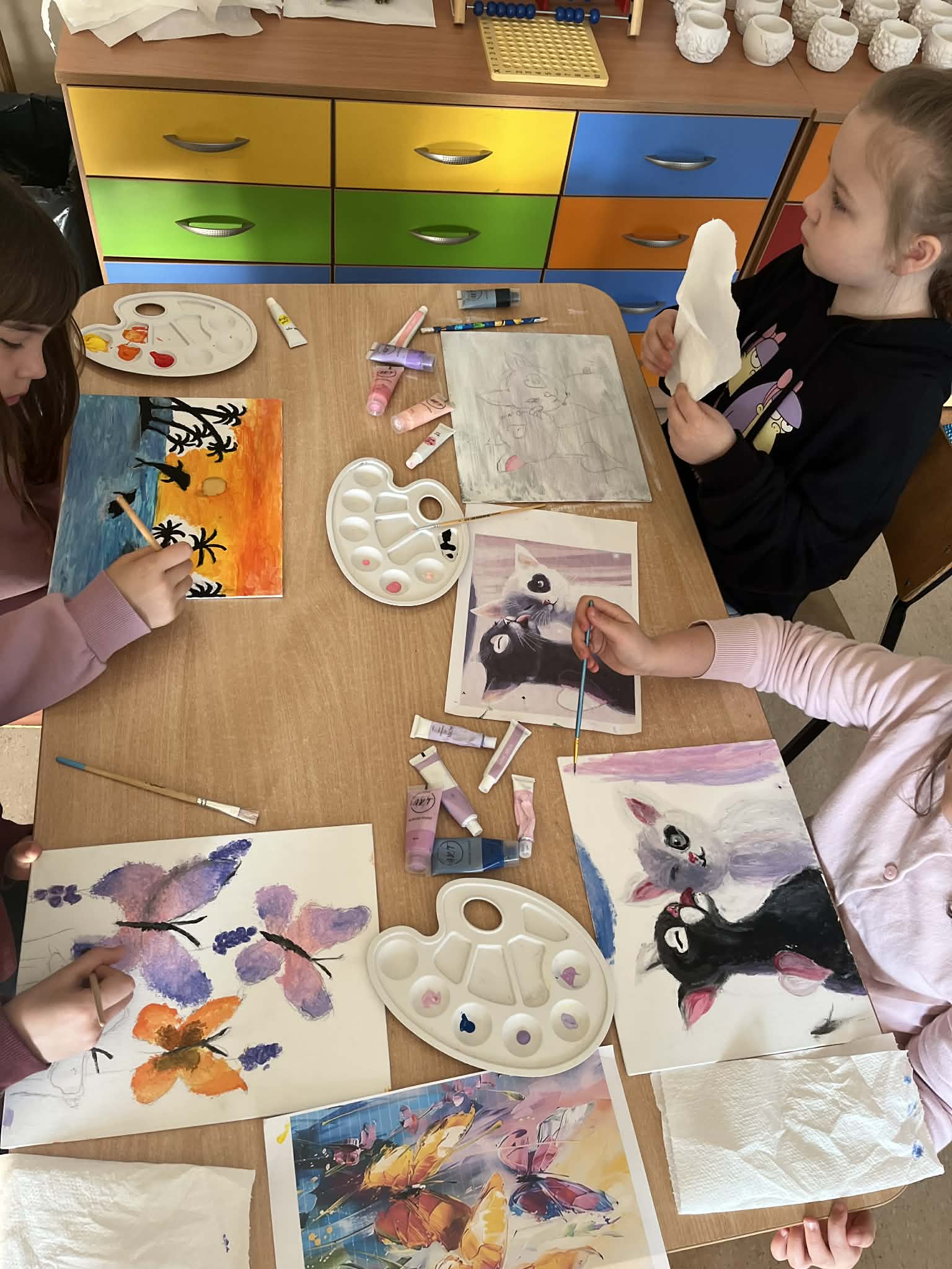 Ciąg dalszy malowania farbami na magnesach pokrytych płótnem. Dzisiaj młodzi artyści malowali zachód słońca.