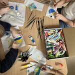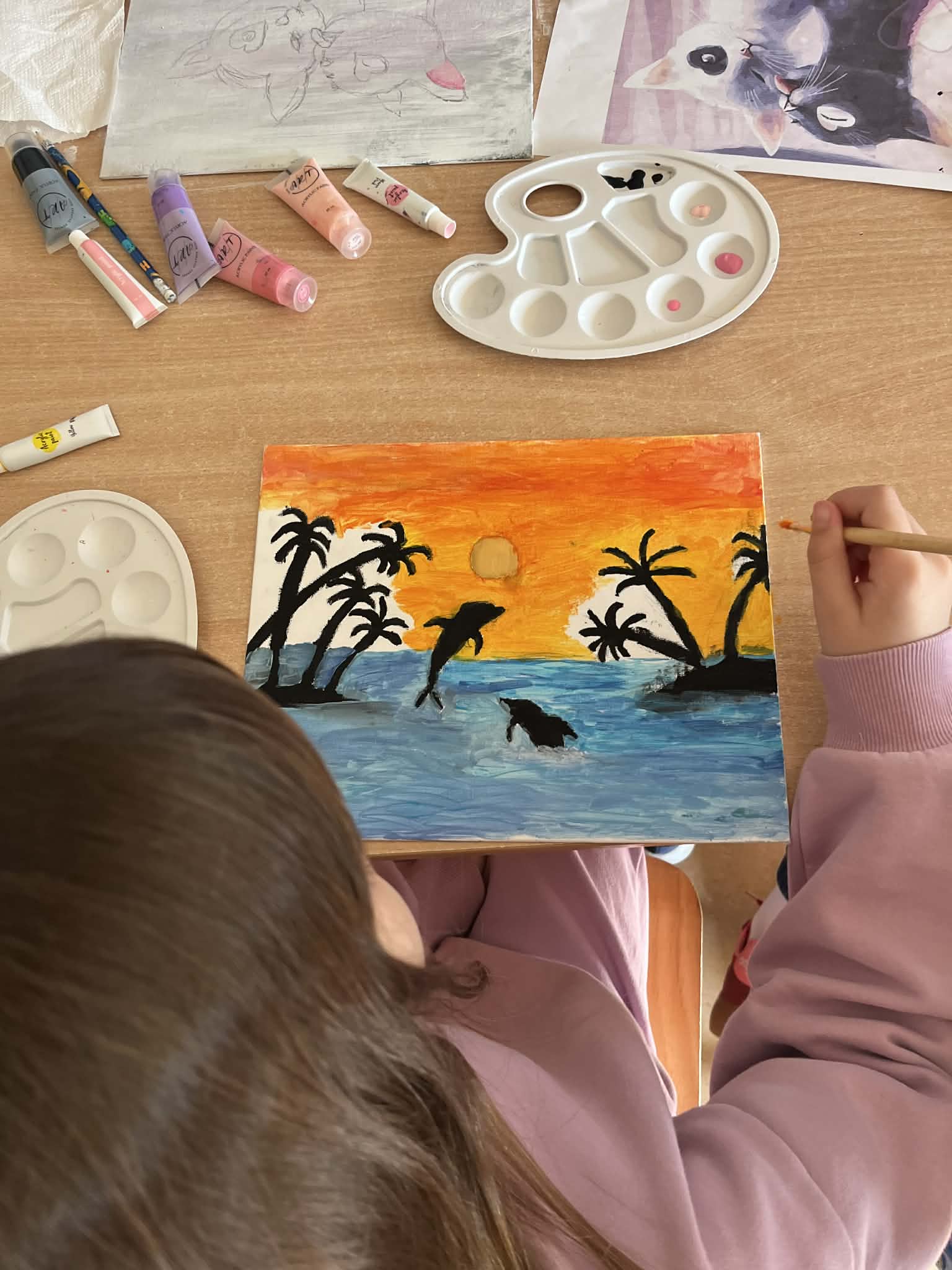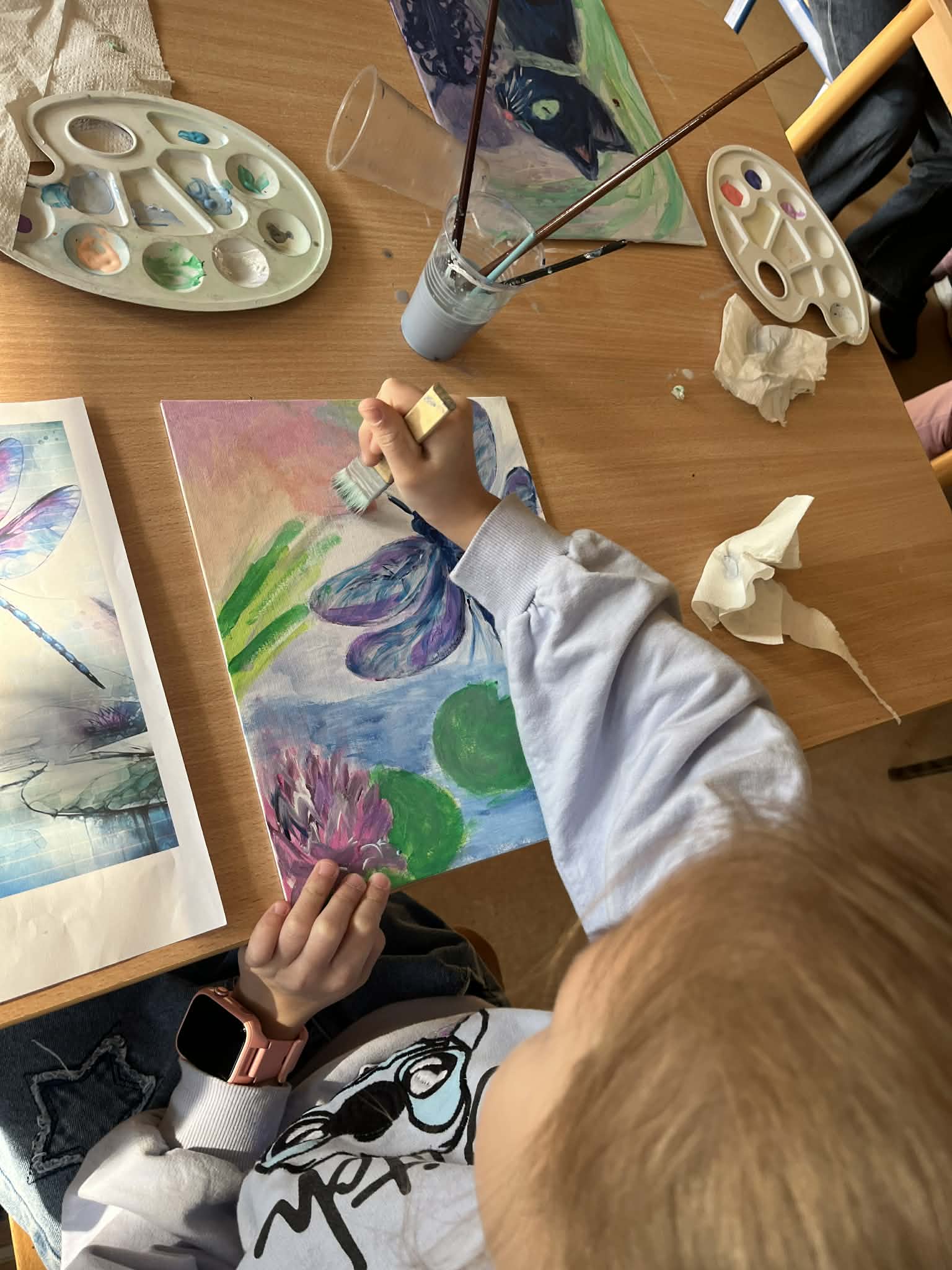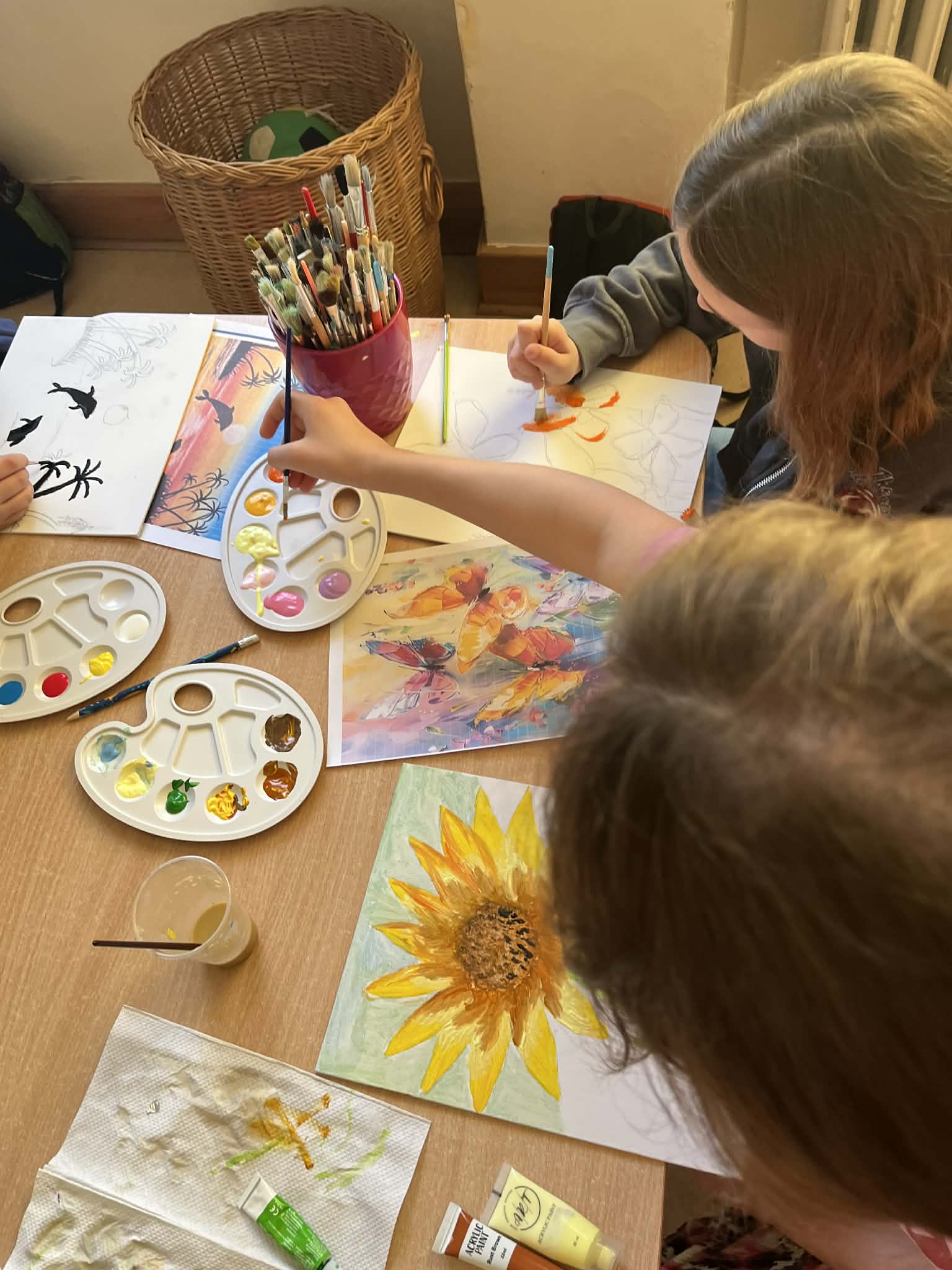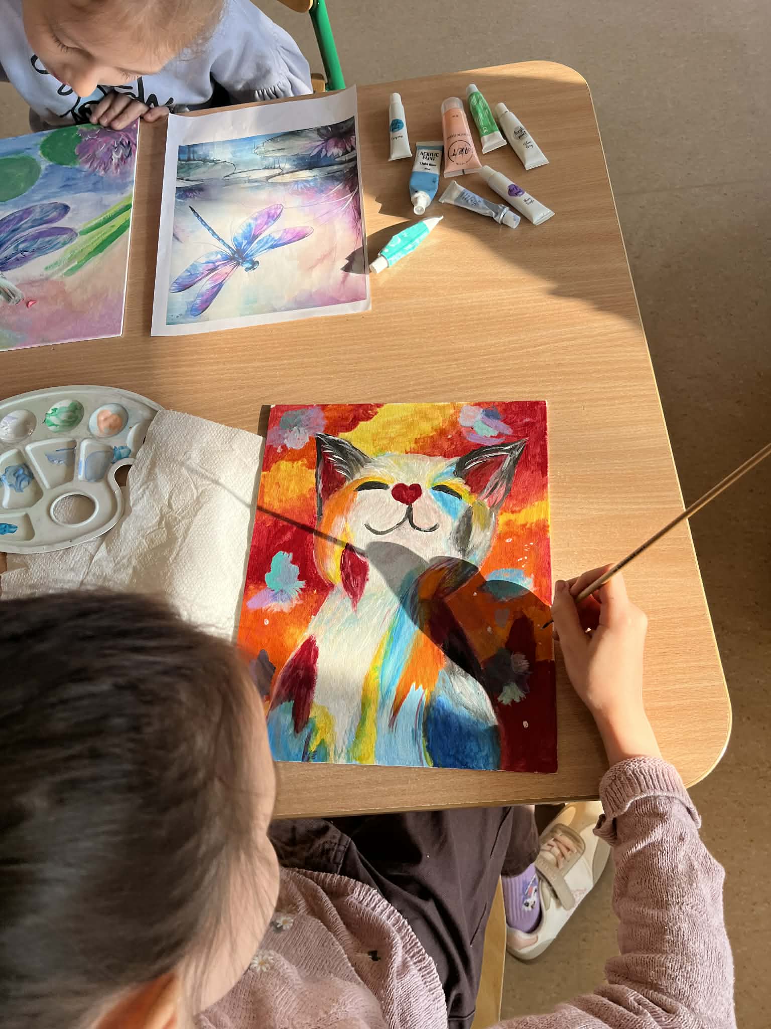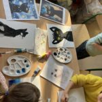 Ciąg dalszy malowania farbami na magnesach pokrytych płótnem. Dzisiaj młodzi artyści malowali zachód słońca.