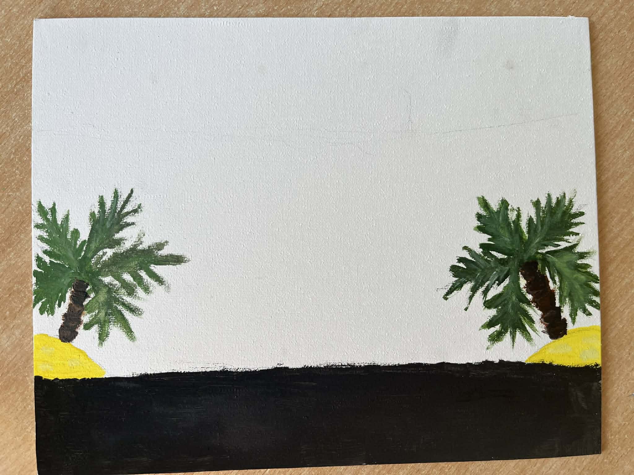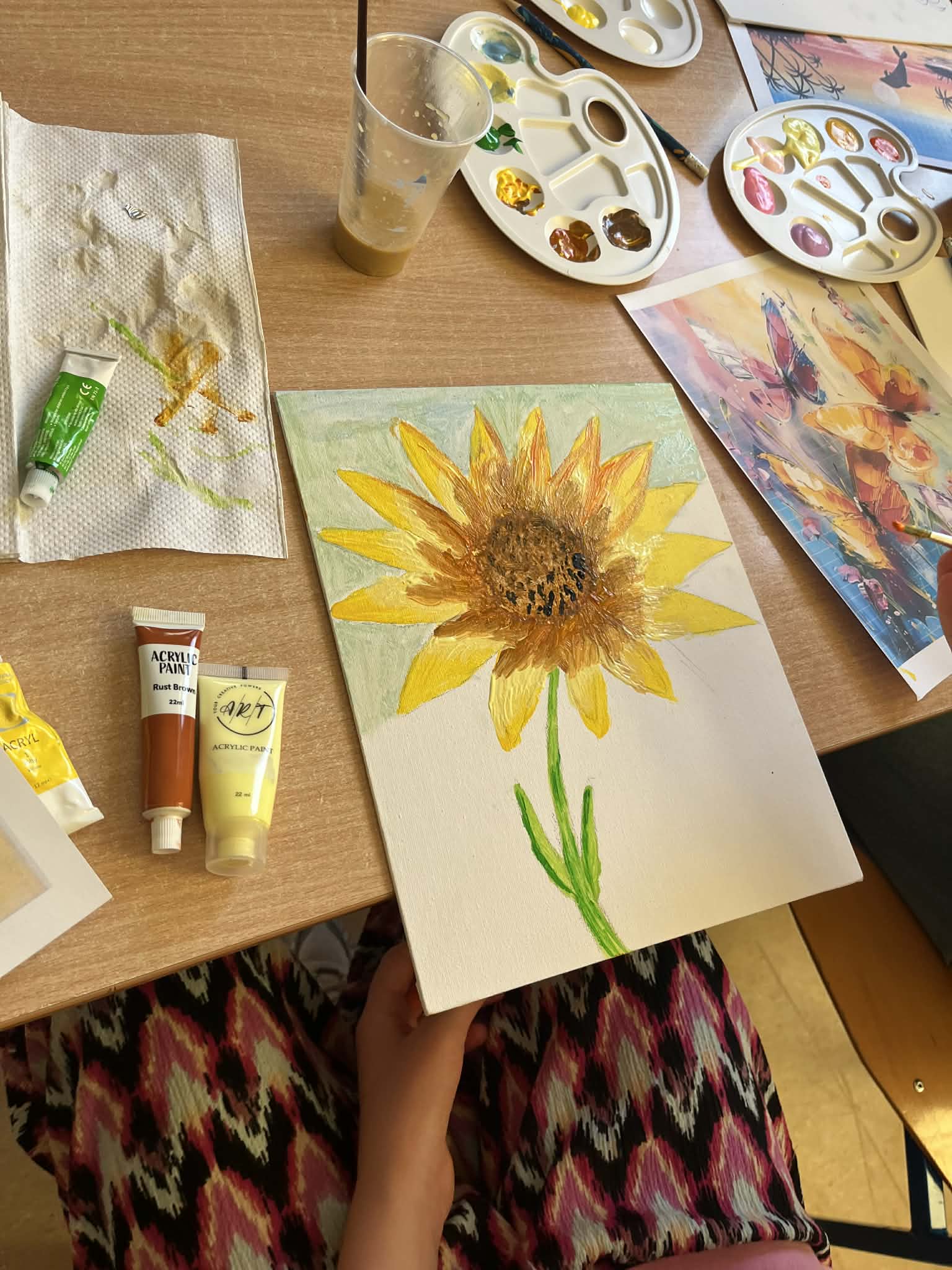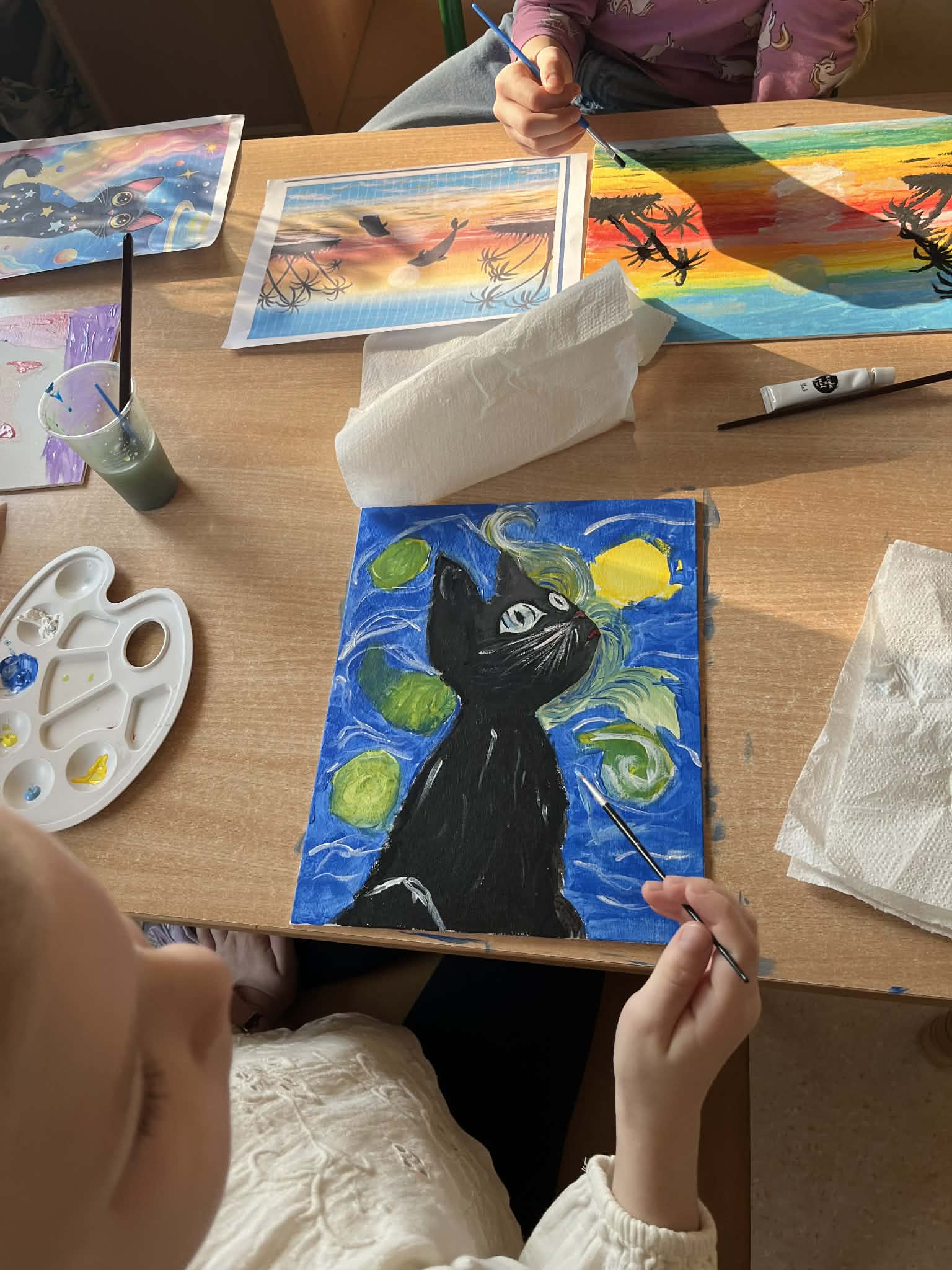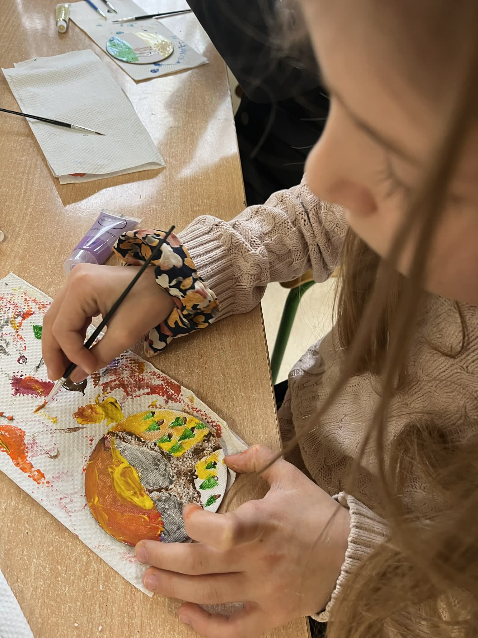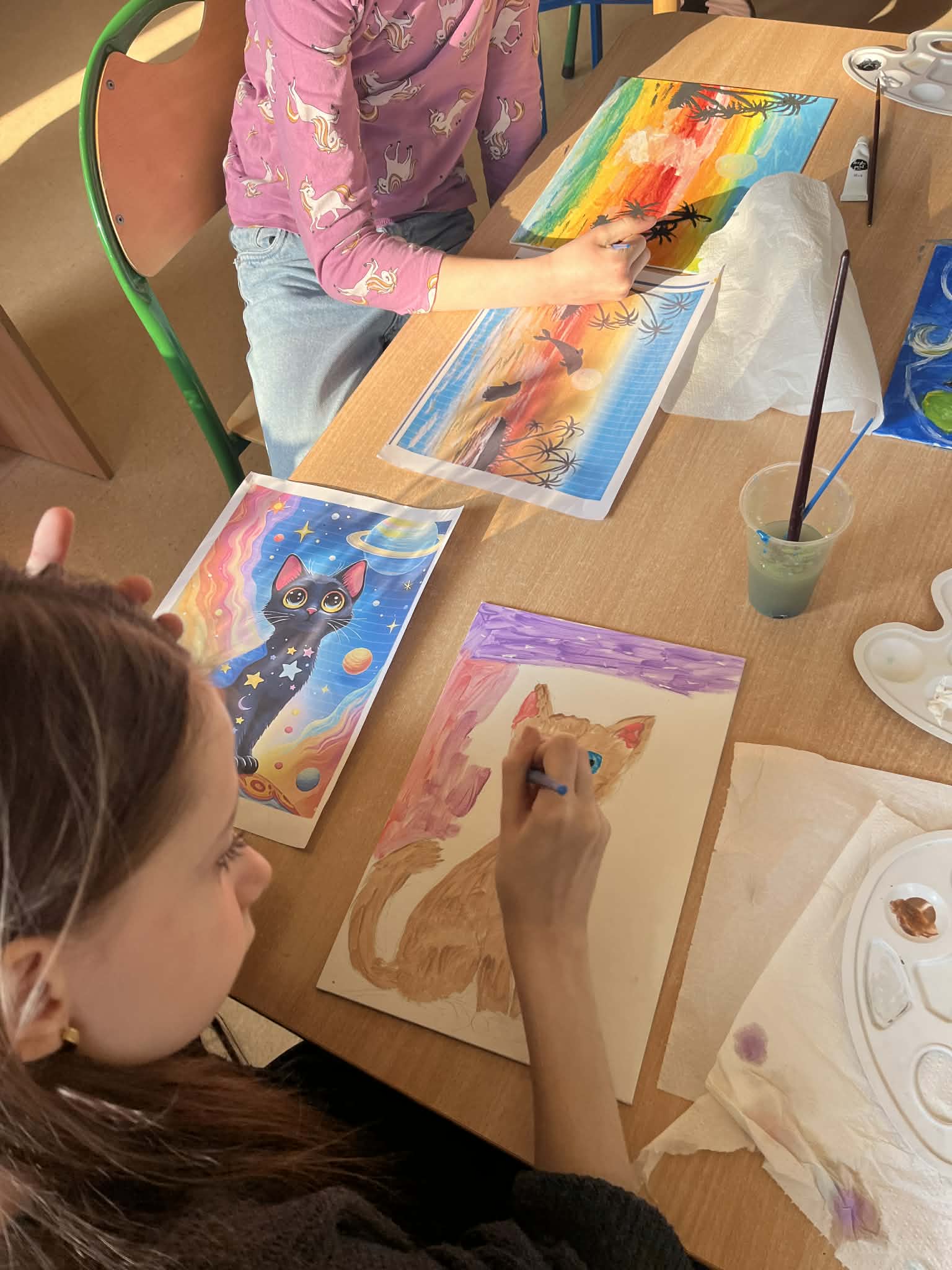 Ciąg dalszy malowania farbami na magnesach pokrytych płótnem. Dzisiaj młodzi artyści malowali zachód słońca.