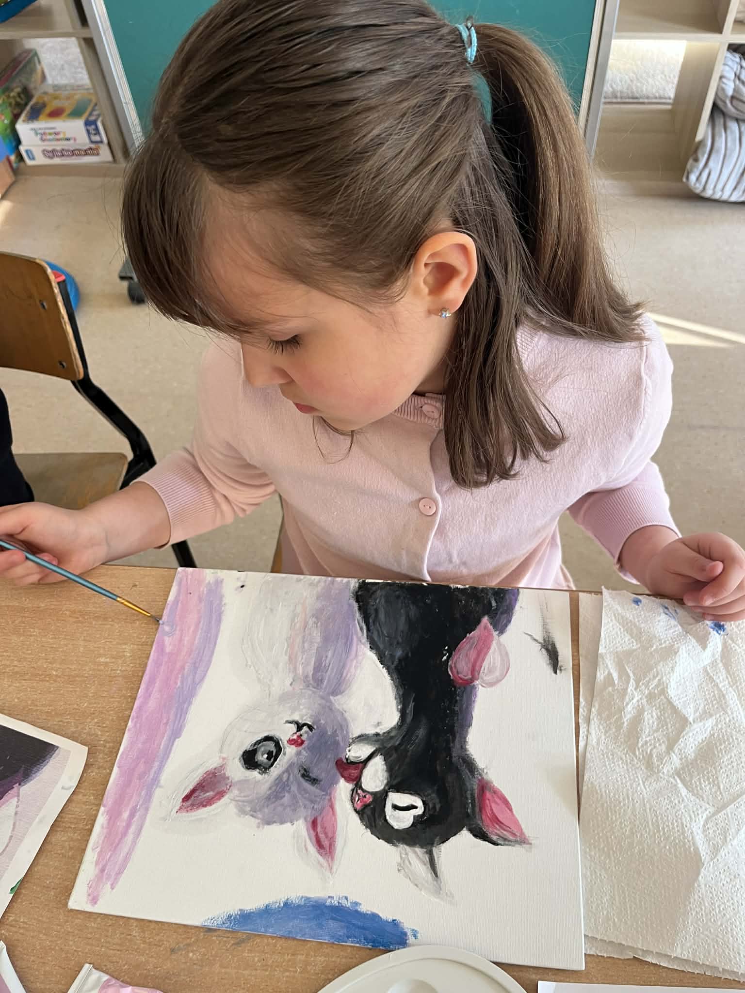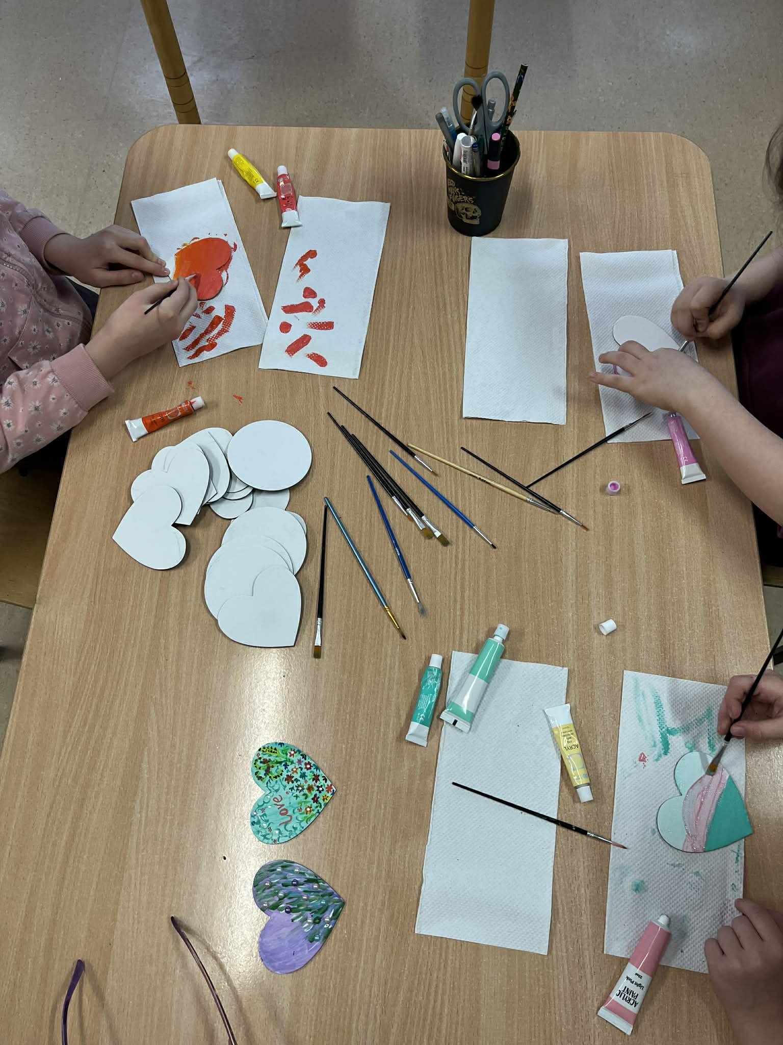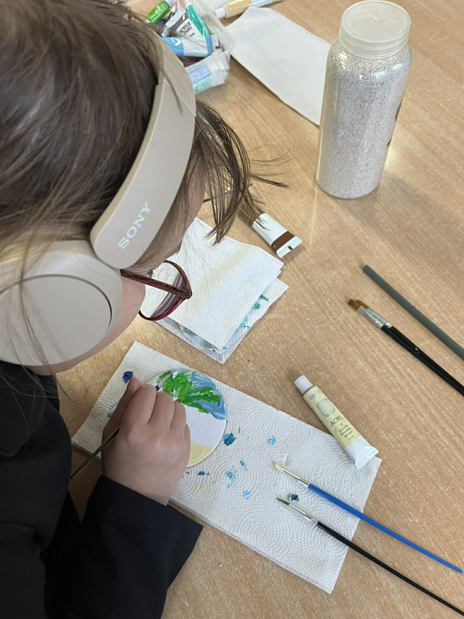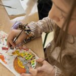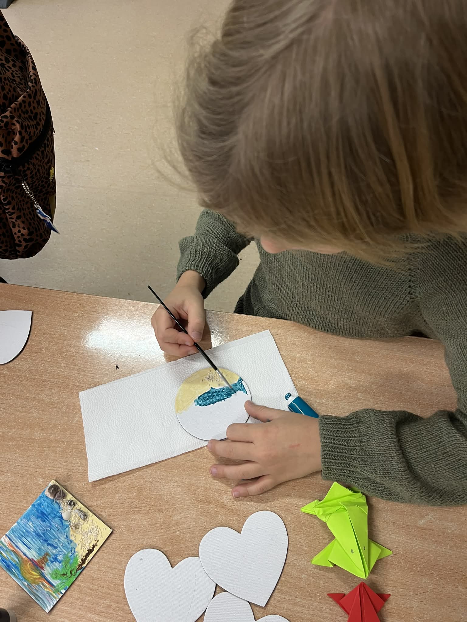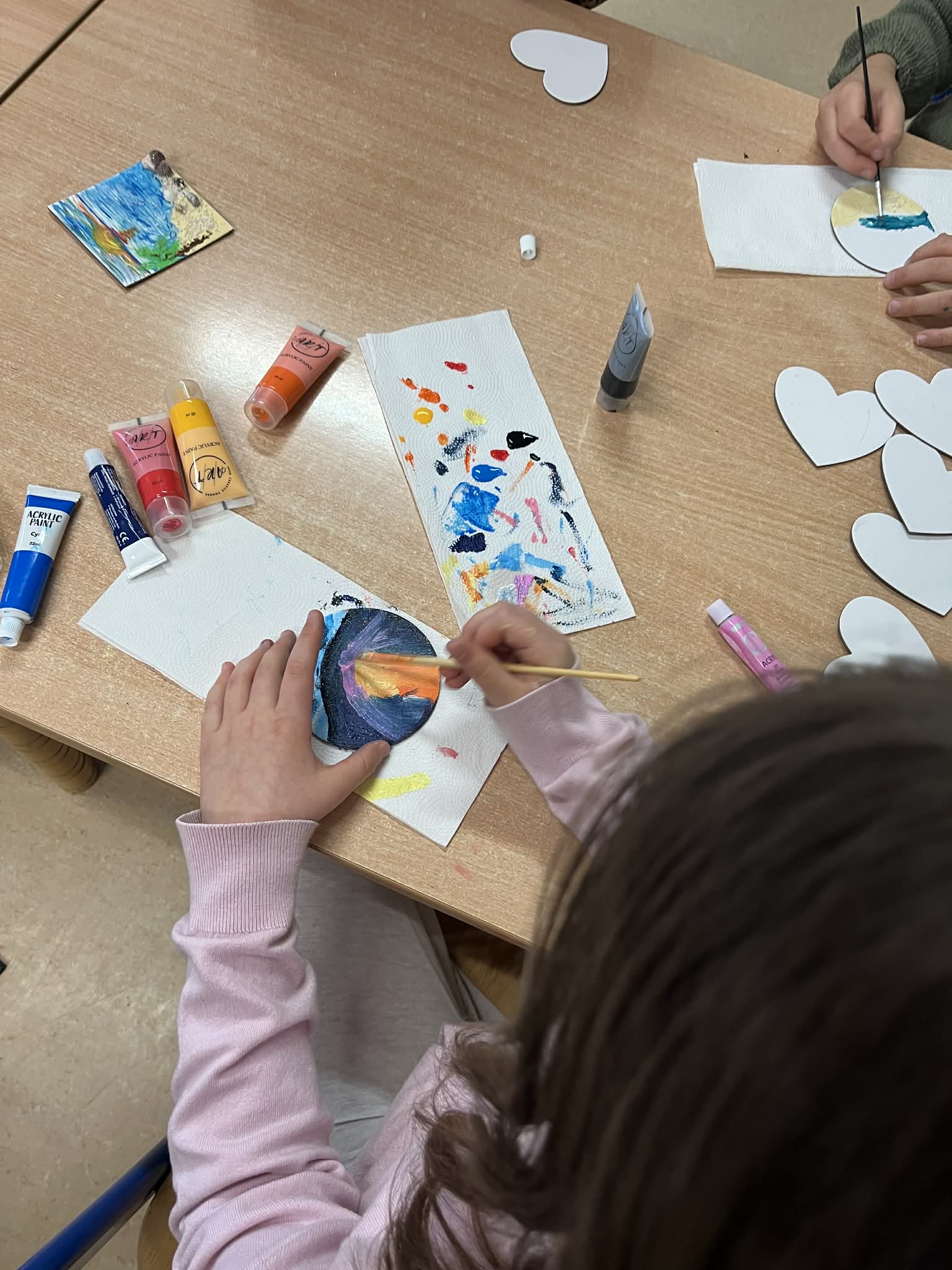 Ciąg dalszy malowania farbami na magnesach pokrytych płótnem. Dzisiaj młodzi artyści malowali zachód słońca.