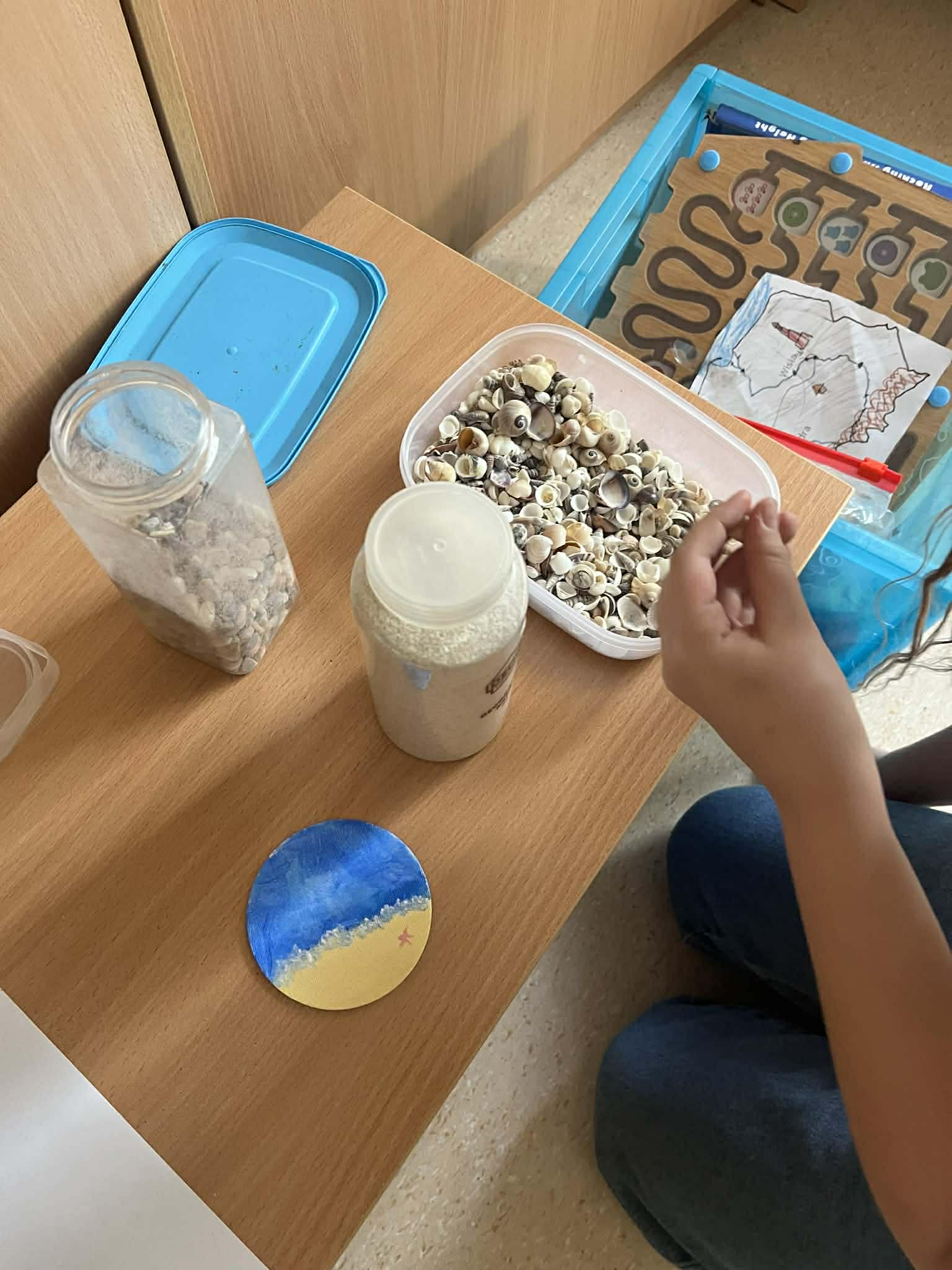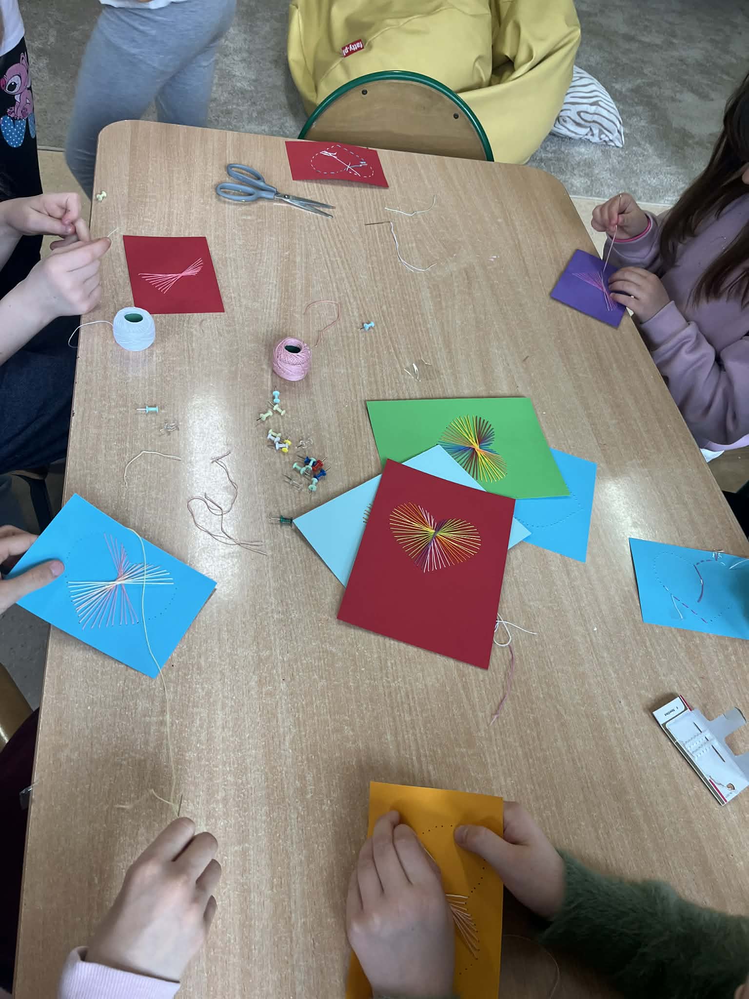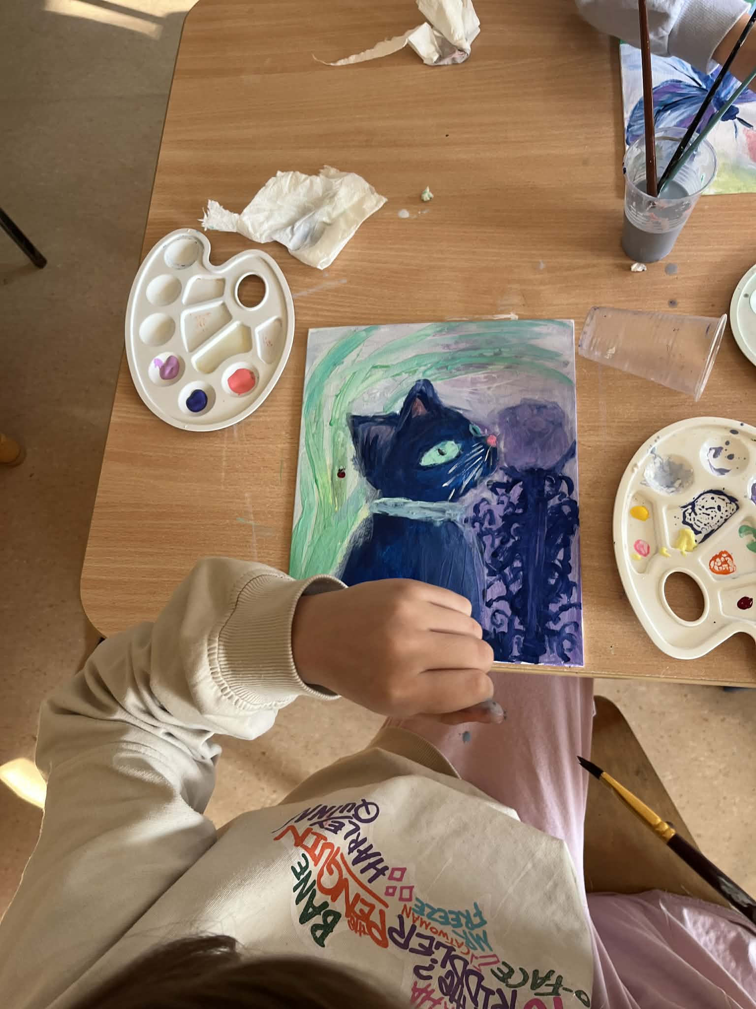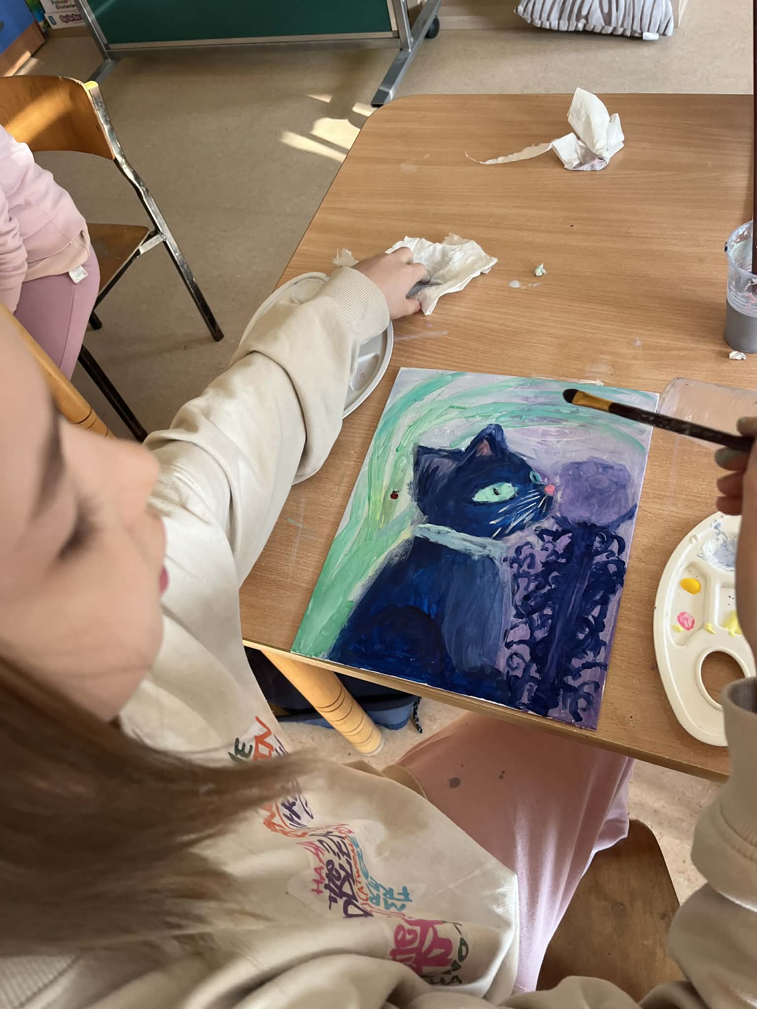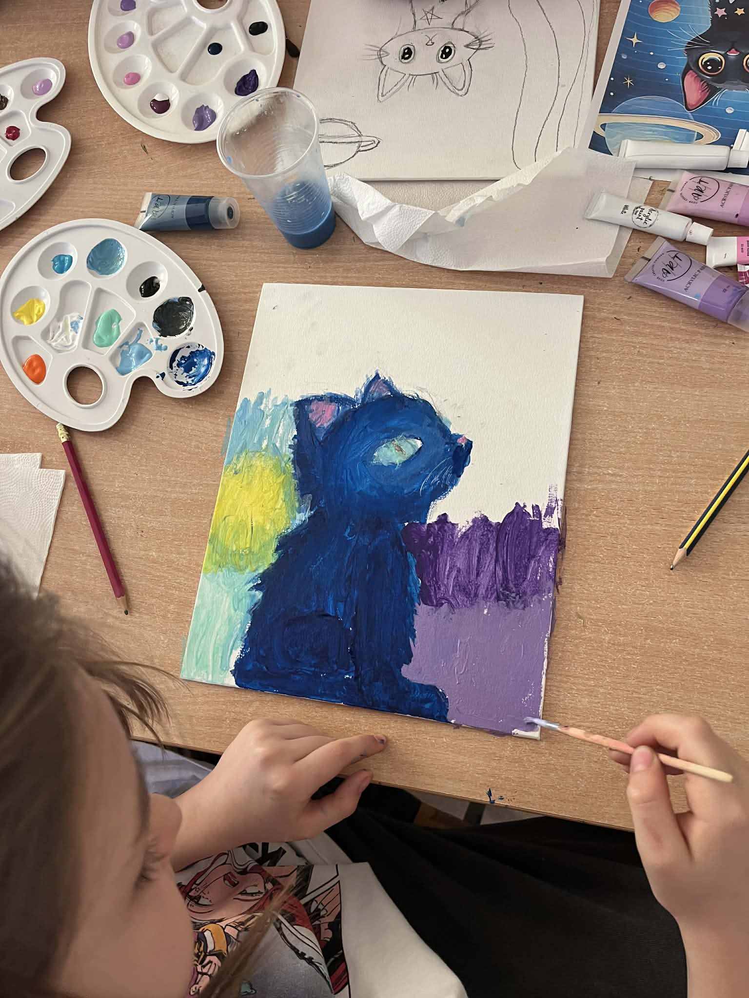 Ciąg dalszy malowania farbami na magnesach pokrytych płótnem. Dzisiaj młodzi artyści malowali zachód słońca.